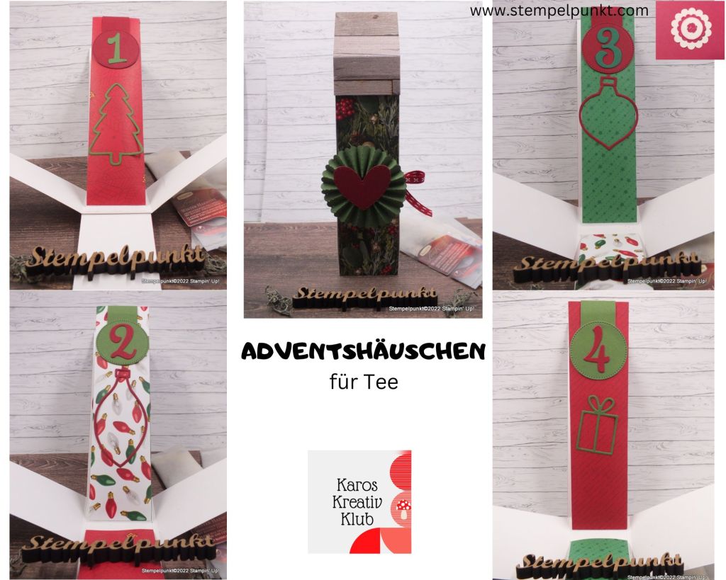 Hier kommt mein zweites ADVENTSHÄUSCHEN – gebastelt in #karoskreativklub am letzten Freitag. Die Maße habe ich verändert, da ich diesmal vier längliche Teebeutel hineinpacken möchte. Ich habe wieder mit einem älteren Designerpapier gearbeitet ( ‚Froher Lichterschein‘).