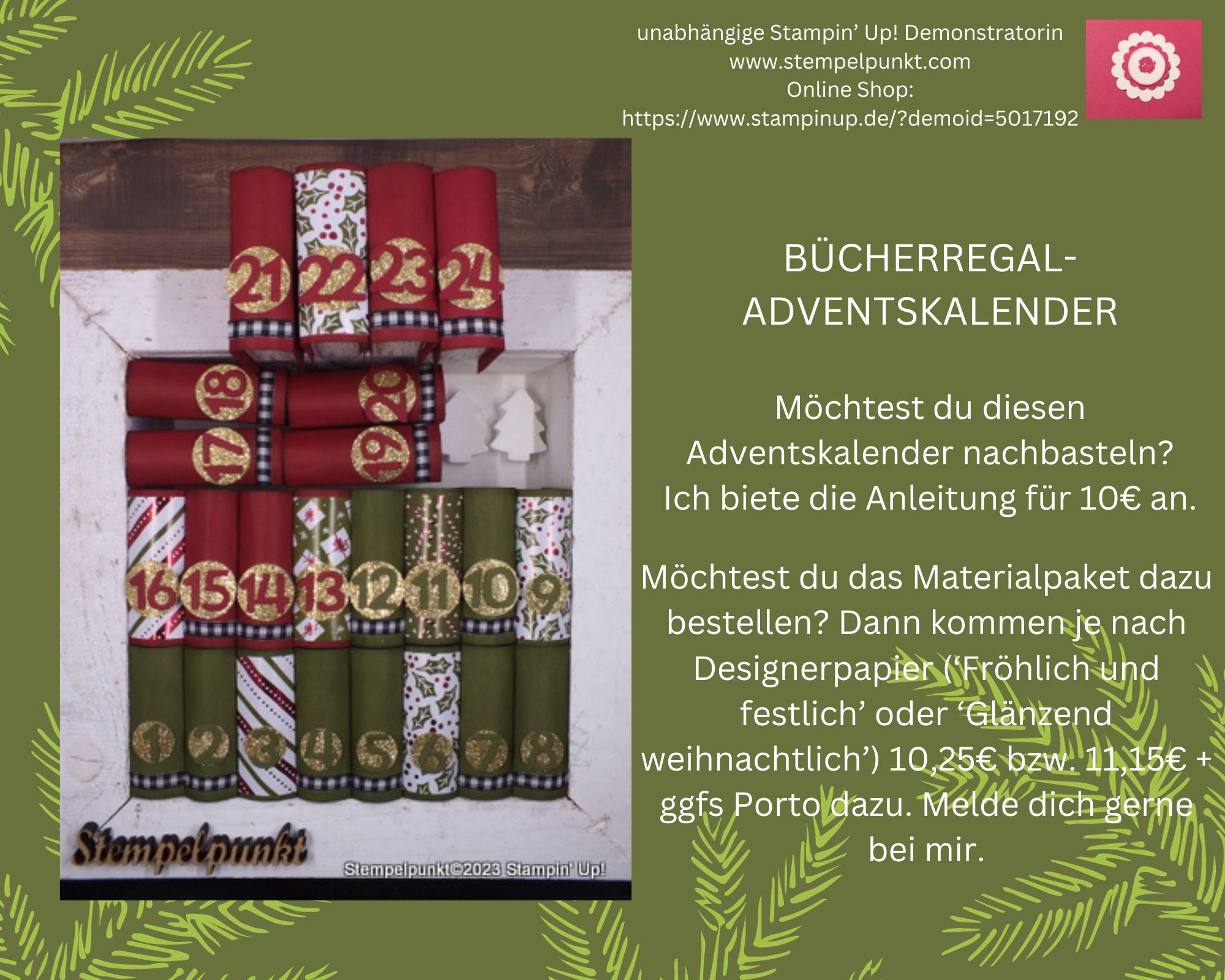 Der Monat November eignet sich hervorragend für die Herstellung von Adventskalendern. Gefällt dir dieser BÜCHERREGAL-ADVENTSKALENDER? Du kannst die Anleitung bei mir bestellen. Voraussichtlich gibt es auch ein kleines Video (privat) dazu. Entweder verwendest du eigenes Material, oder du bestellst das Materialpaket dazu. Ich stelle das Materialpaket nach deinen Wünschen zusammen. Nicht enthalten sind: der Holzrahmen, die Goldkreise, die Zahlen und das Bändchen. Kreise und Zahlen könnte ich gegen Aufpreis liefern (Du bestellst das Glitzerpapier 162288 ‚Selbstklebendes Glitzerpapier in Silber und Gold‘ 12″x12″, 8,50€ und bekommst die Zahlen gratis). Es gibt also viele Varianten, die wir gerne besprechen können.