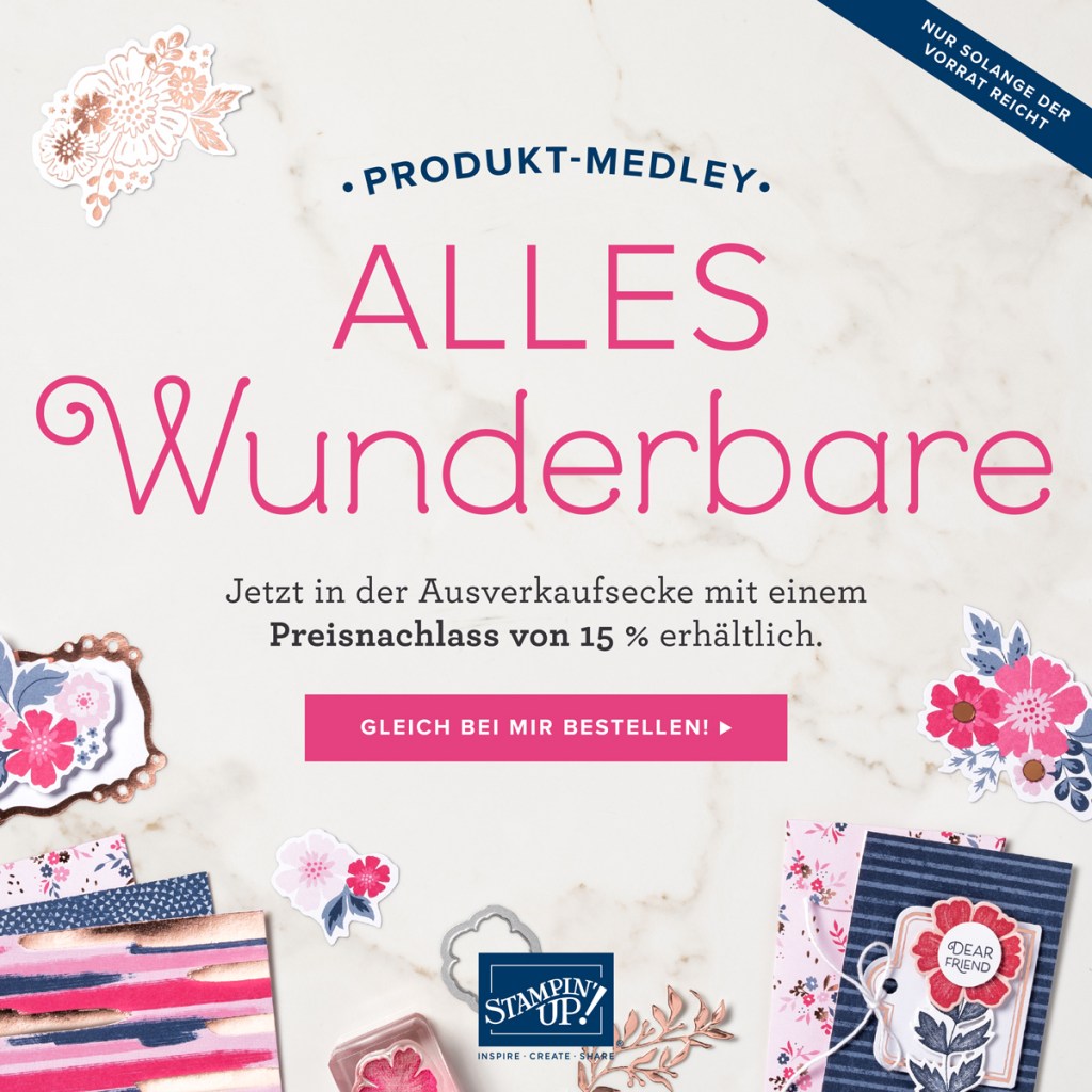 Kennt ihr noch das Produktmedley ‚Alles Wunderbare‘. Das gab es limitiert im Frühjahr. Da es noch einen Restbestand gibt, könnt ihr es jetzt mit 15% Rabatt bestellen (Ausverkaufsecke). Ich würde nicht zu lange warten.