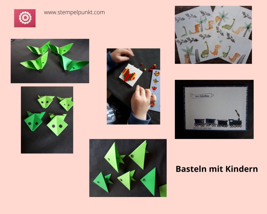 Mit meinem 5-jährigen Enkelkind kann man schon richtig gut basteln. Er ist dabei voll motiviert und konzentriert. Wir sind kreativ mit Perlenstecken, mit Origami und mit Stempeln. Wie gut, dass es in jedem Katalog von Stampin‘ Up! so schöne Kindermotive gibt.