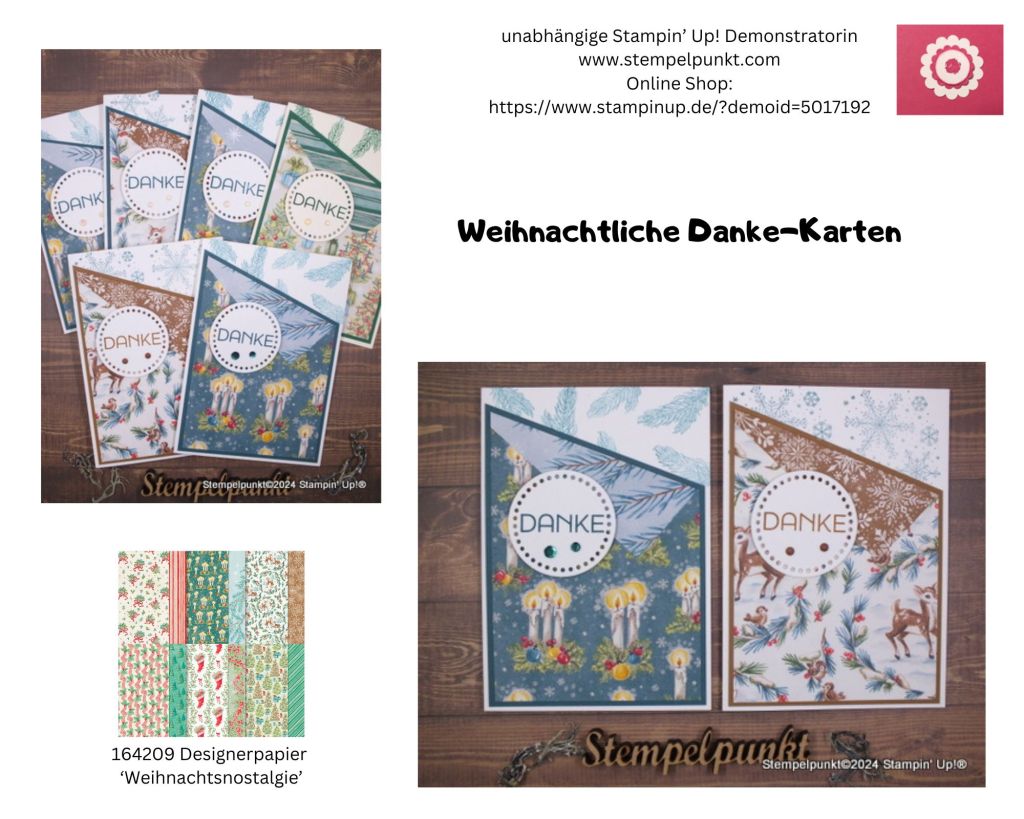 Heute möchte ich diese schönen Danke-Karten zeigen. Meine Kundinnen haben sie als Dankeschön zu ihrer Bestellung bekommen. Mit dem richtigen Designerpapier wirken sie von allein. Beim Verkauf dieses Designerpapiers spendet Stampin‘ Up! 3,00€ an Organisationen, die sich um die Zukunft von Kindern überall auf der Welt engagieren.