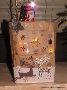 Im Oktober gab es ein virtuelles Teamtreffen mit unserer Upline Ilonka. Ich hatte mich für die Teilnahme an der Challenge ‚IMDI – ich Material, du Idee‘ angemeldet. Ilonka hat uns eine amerikanische Butterbrottüte, einen Holzstern und 1 flachen Schoko- Weihnachtsmann zur Verfügung gestellt. Mit zusätzlichem Stampin‘ Up!-Material kam bei mir diese beleuchtete Weihnachtstüte heraus. Das ist doch eine schöne Weihnachtsdeko.