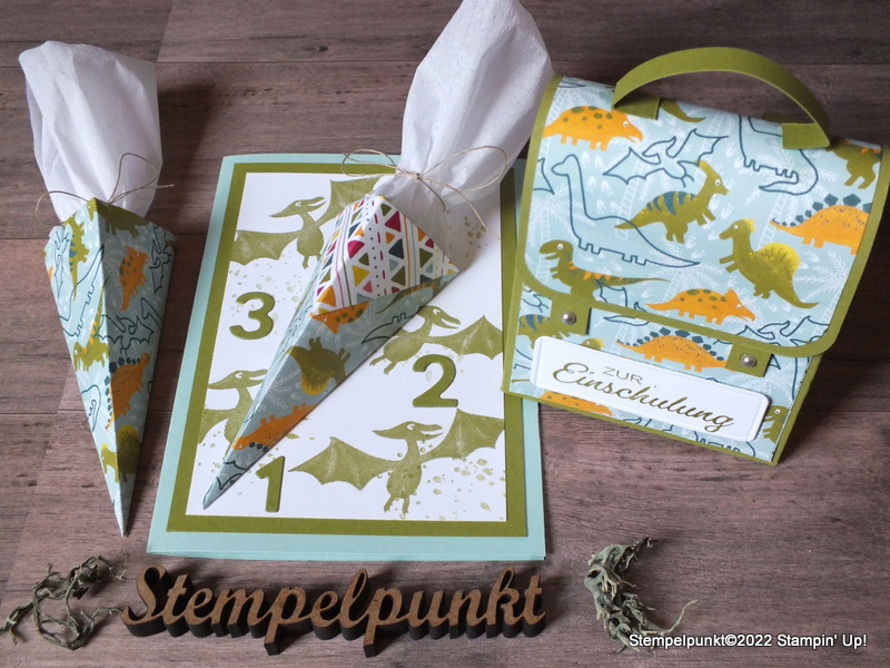 Das Thema ‚Einschulung‘ ist bei mir gerade total angesagt. Gestern wurde mein ältestes Enkelkind eingeschult. Das ist schon ein ganz besonderer Tag. Und als Kreativfan musste ich natürlich auch Karten basteln. Die Anleitung für die Schultüte habe ich bei Steffi’s Kartenhaus gesehen. Wie bei meinem (ersten) Schulranzen habe ich mit dem Designerpapier ‚Im Dino-Land‘ und mit dem passenden Stempelset gearbeitet. Ein guter Ersatz ist das Produktpaket ‚Fröhlicher Wald‘ (JK, Seite 46f).