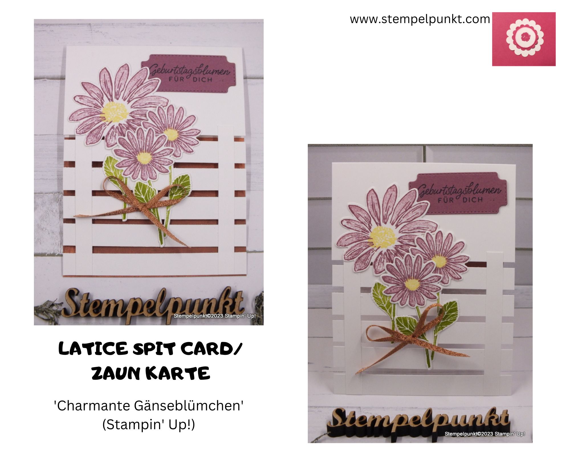 Heute zeige ich eine LATTICE SPLIT CARD nach einer Idee von Inky Hands Warm Hearts. Es kam das Produktpaket ‚Charmante Gänseblümchen‘ zum Einsatz. Das ist derzeit eines meiner Lieblingsprodukte aus dem neuen Jahreskatalog von Stampin‘ Up! Deshalb werde ich dieses Produktpaket auch im morgigen 16. VIDEO HOP Stempelpunkt & Co einsetzen.