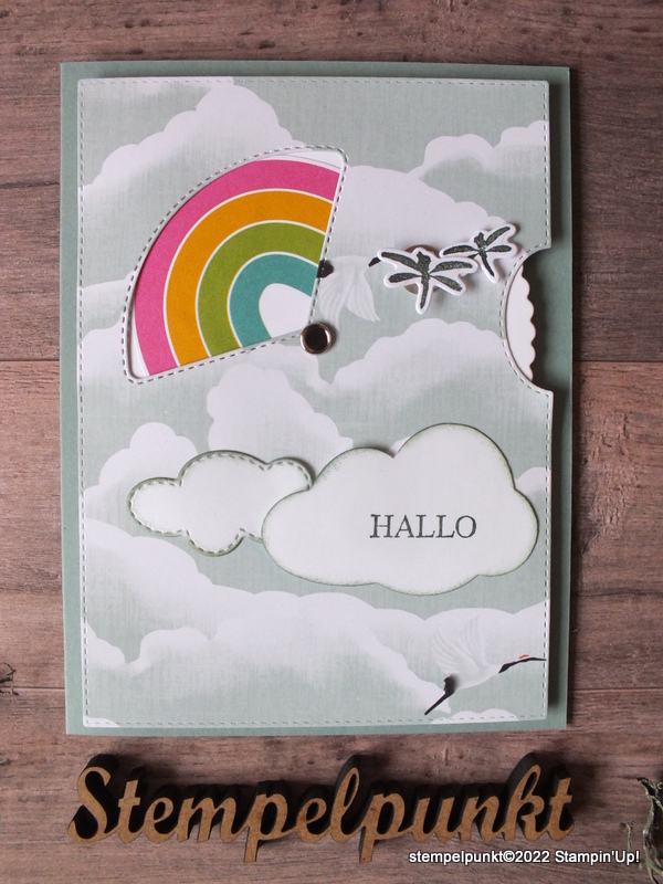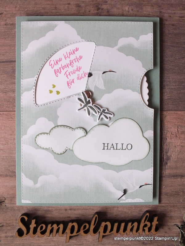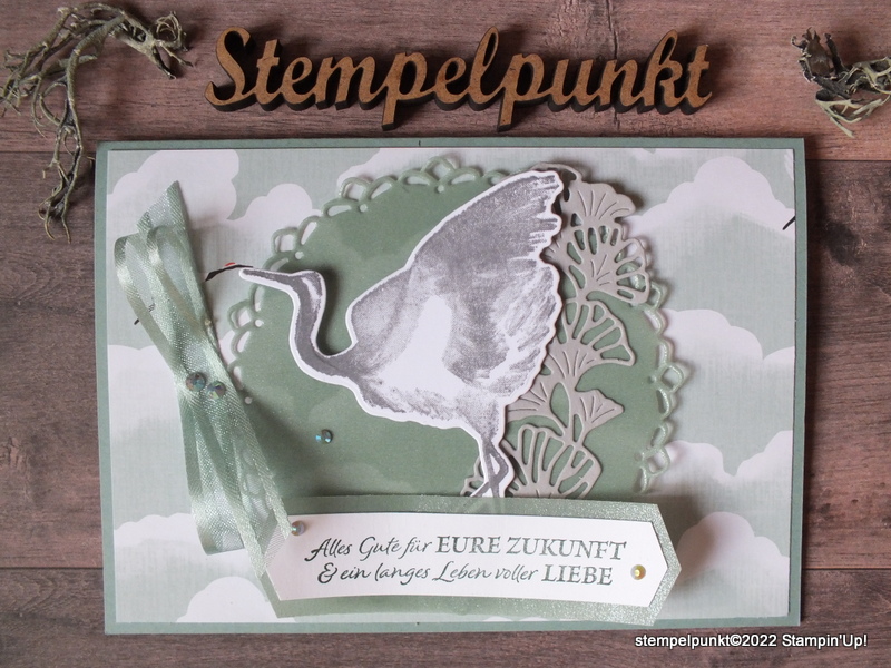 Ich habe das wunderschöne Produktpaket ‚Glückskranich‘ aus dem aktuellen Minikatalog von Stampin‘ Up! verwendet. Somit gibt es auch glücklicherweise wieder ein Stempelset für Hochzeiten. Und wieder kam meine Lieblingsfarbe ‚Seladon‘ zum Einsatz (In Color 2021-2023). Und das Designerpapier ‚Glückssymbole‘ ist ein Traum – sehr edel, z.T. mit Goldeffekten.