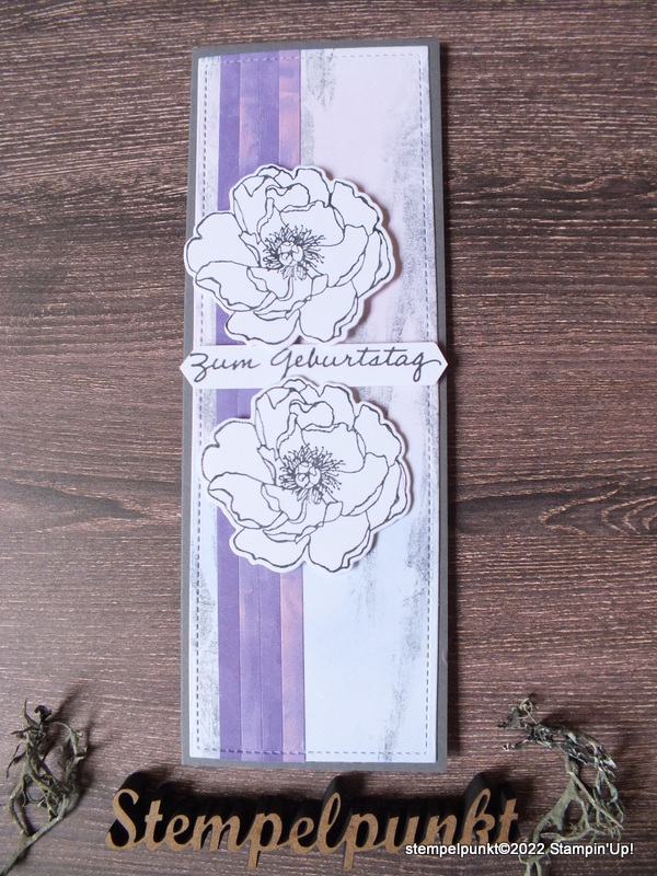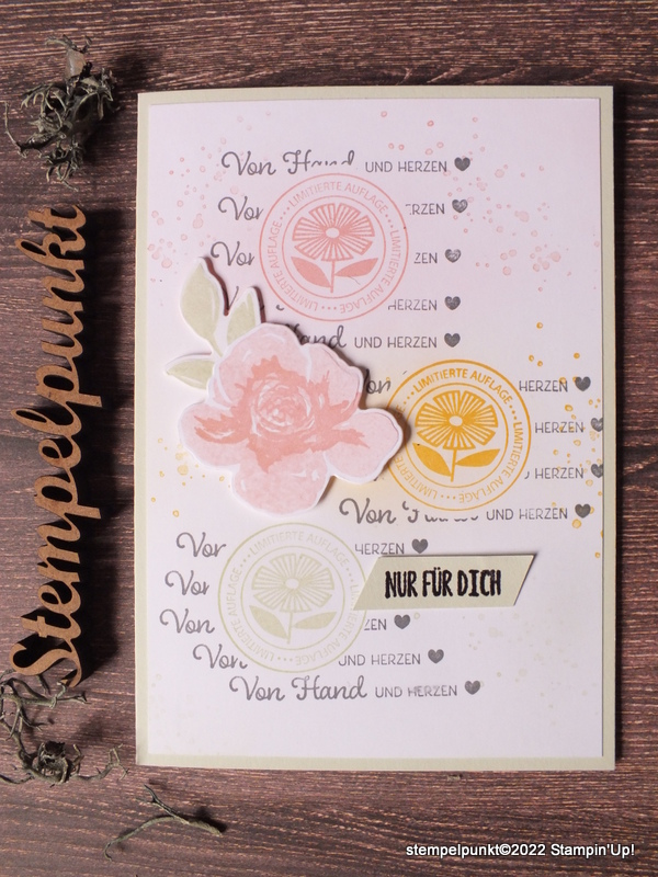 Gestempelt wurde mit den vorgegebenen Farben und mit dem neuen Stempelset ‚Limitierte Auflage‘, das ab dem 3.Mai aus dem Jahreskatalog 2022-2023 bestellbar ist. Als Stampin’Up!-Demonstratorin kommt man schon früher als die Kunden an die brandneuen Produkte.