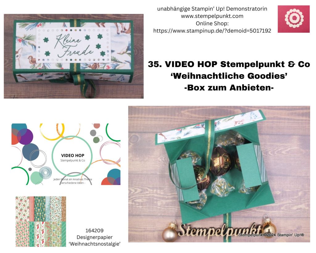 Heute gibt es den 35. VIDEO HOP von Stempelpunkt & Co. Einige Stampin‘ Up!-Demonstratorinnen haben sich zusammengetan, um euch an jedem 2. Samstag im Monat jeweils ein Video zu einem vorgegebenen Thema zu zeigen. Unser Thema im Dezember ist ‚Weihnachtliche Goodies‘. Ich zeige eine ‚BOX ZUM ANBIETEN‘** dem Designerpapier ‚Weihnachtsnostalgie‘ von Stampin‘ Up! .