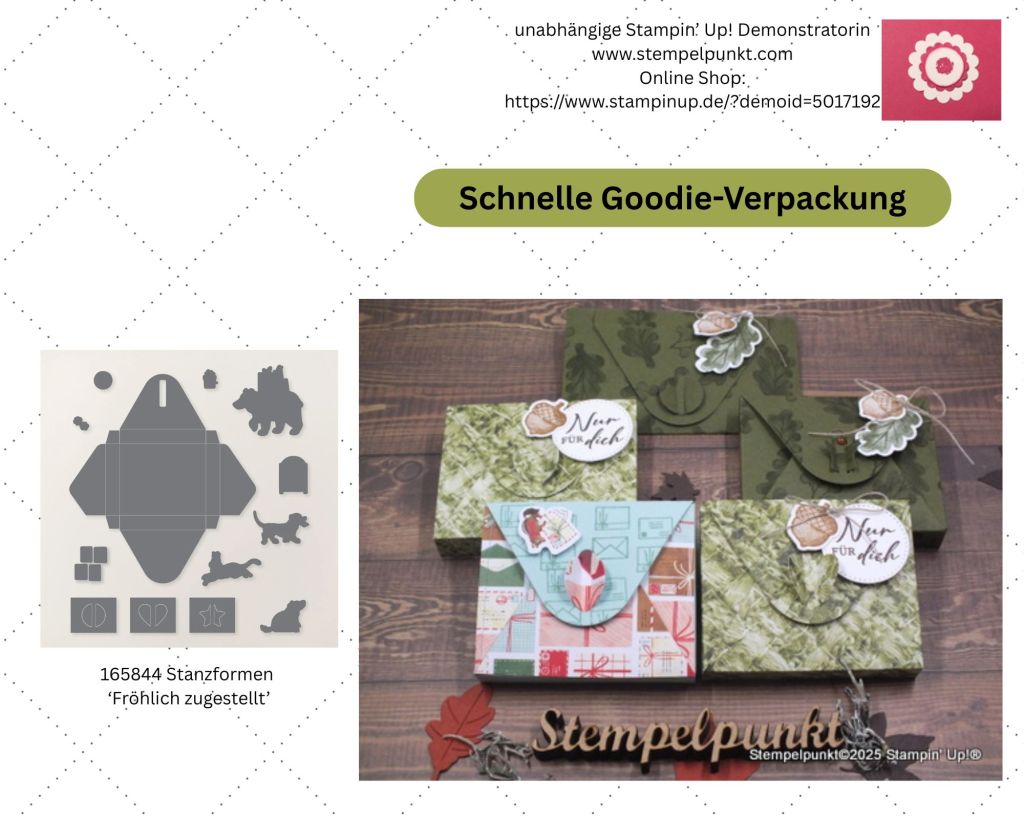 Heute zeige ich eine schnelle, süße Goodie- Verpackung. Vor Weihnachten muss es auch schon mal schnell gehen. In der Produktreihen-Kollektion ‚Zustellung vom Nordpol‘ gibt es die Stanzform ‚Fröhlich zugestellt‘ für diese Box. Dazu gehören 3 verschiedene Verschlüsse.