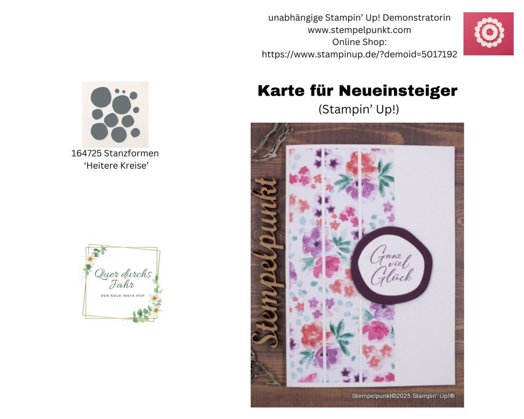 Das Thema des Instahop Quer durchs Jahr ist heute ‚Karte für Neueinsteiger‚. D. h .die Karte soll einfach und schnell zu werkeln sein. Und es sollten nur wenige Produkte verwendet werden, da man am Anfang noch nicht so viel Material hat. Ich habe mit den neuen Stanzformen ‚Heitere Kreise‘ (Minikatalog Stampin‘ Up!) und dem Designerpapier ‚Traum von Blüten‘ (Sale-a-Bration, gratis ab 70€) gearbeitet. Die Stanzformen sind ein guter Ersatz für die ‚Kreise mit Büttenrand‘. Hin und wieder braucht man etwas größere Kreise!