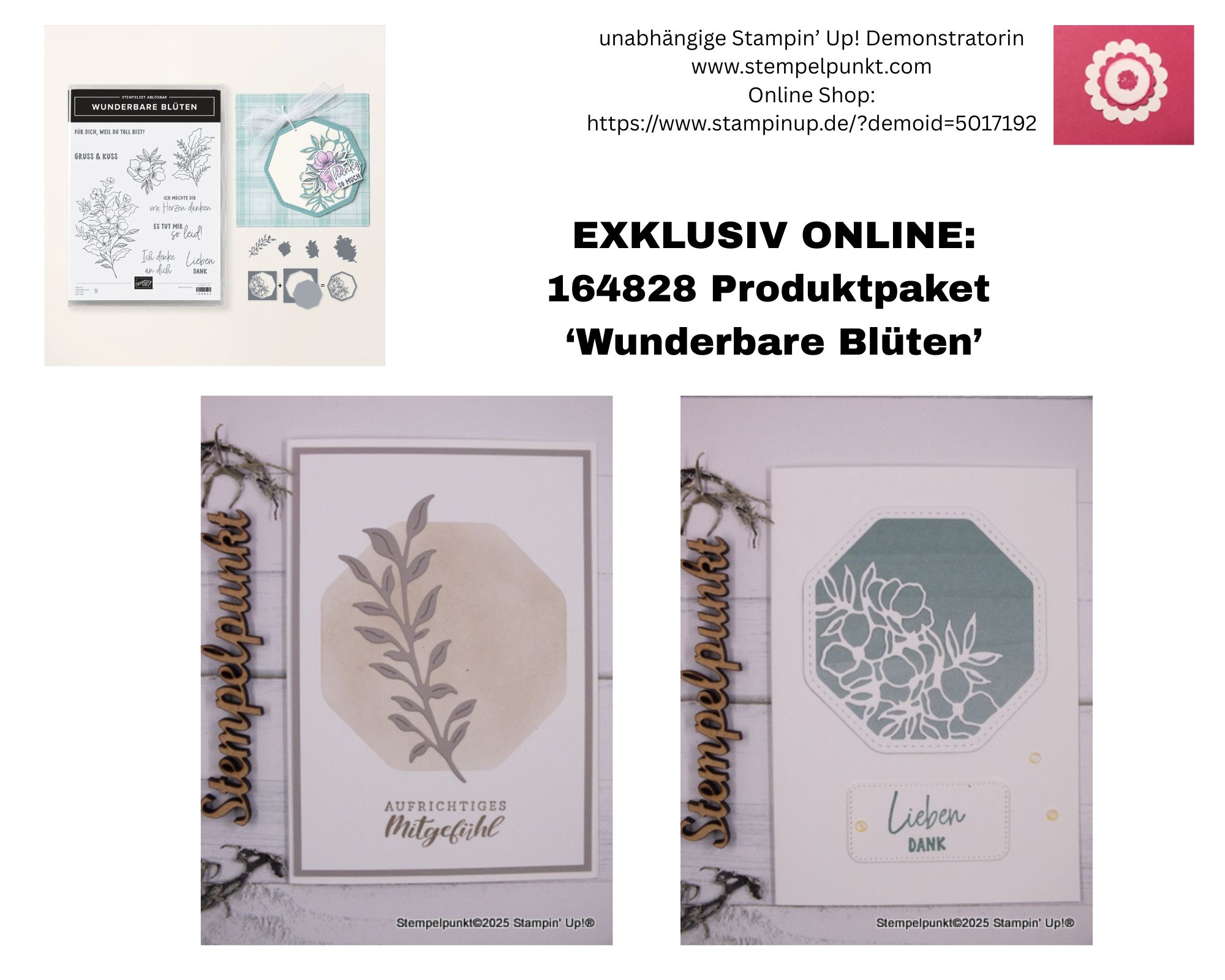 Heute gibt es den 4.Teil der You Tube-Reihe zu den Exklusiv Online-Produkten von Stampin‘ Up! An 5 Tagen gibt es 5 Videos, in denen jeweils ein Produktpaket vorgestellt wird- mit jeweils zwei Beispielprojekten. Diesmal geht es um das Produktpaket ‚Wunderbare Blüten‘.
