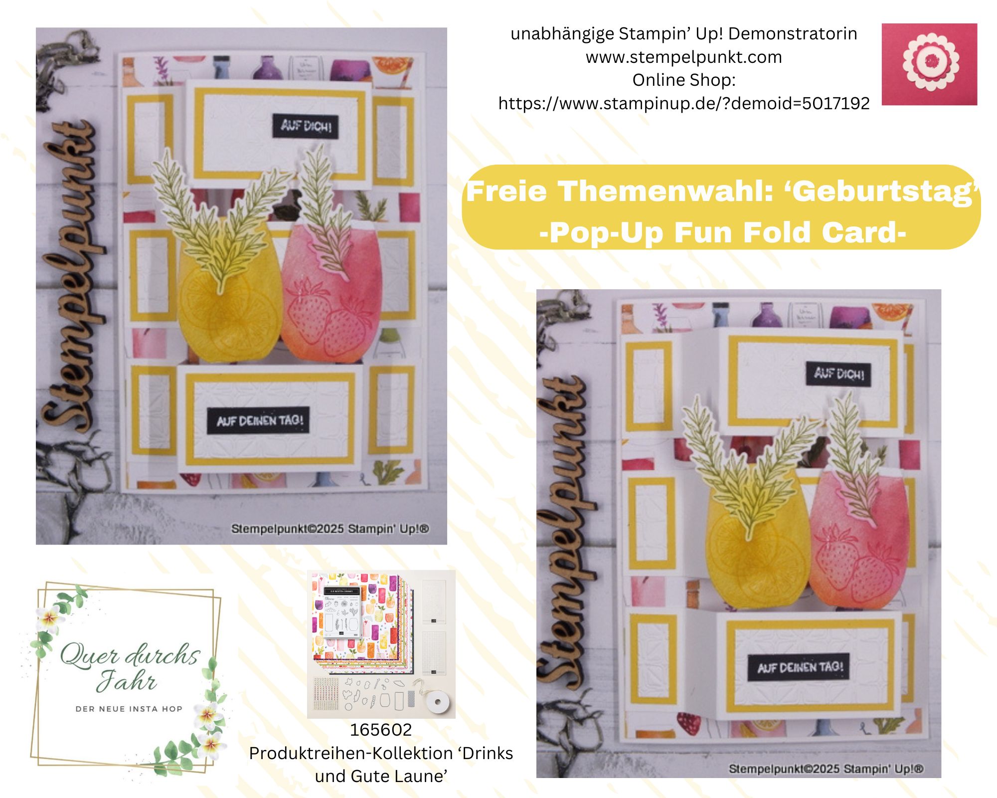 Beim Insta Hop Quer durchs Jahr haben wir heute freie Themenwahl. MeinThema ist ‚GEBURTSTAG‘. Und ich zeige eine ‚POP-UP FUN FOLD CARD‘ mit der Produktreihen-Kollektion ‚Drinks und Gute Laune‘ von Stampin‘ Up! (Exklusiv Online). Die Karte lässt sich flach zusammenfalten.