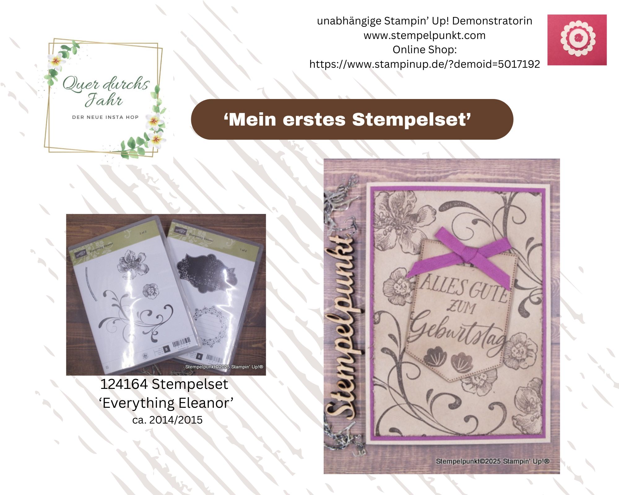 Beim Insta Hop Quer durchs Jahr haben wir heute das Thema ‚MEIN ERSTES STEMPELSET‘. Mein erstes Stempelset von Stampin‘ Up! war das Set‘ Everything Eleanor‘ , ca. aus dem Jahr 2014. Ich finde es immer noch schön. Es eignet sich super für Vintage-Karten. Zusätzlich habe ich das Produktpaket ‚Geburtstagsparty‘ verwendet (Stampin‘ Up!). Neu trifft au alt.