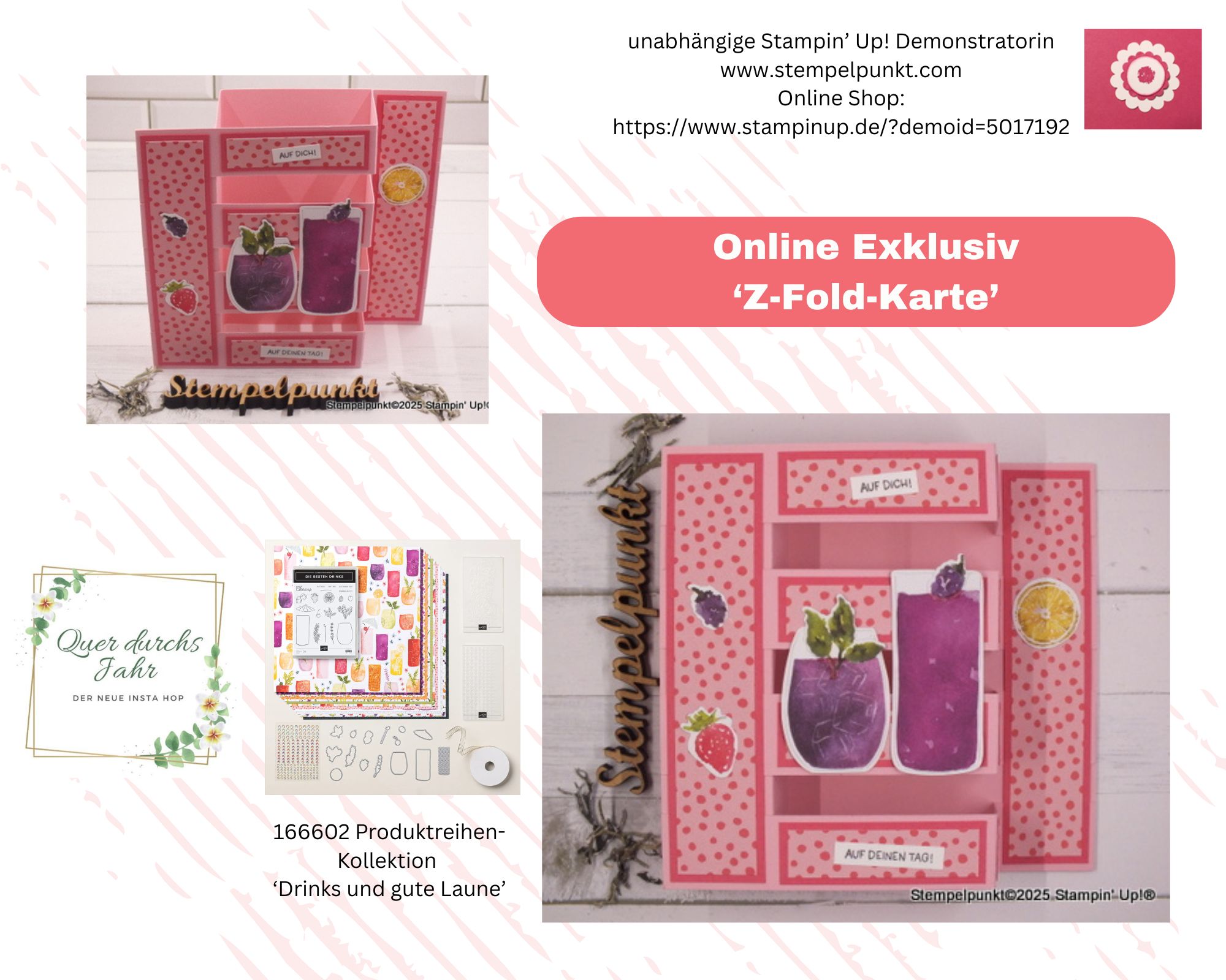 Ich habe mich für die Produktreihen-Kollektion ‚DRINKS UND GUTE LAUNE‘ entschieden. Das passt total gut zu den sommerlichen Temperaturen. Ich zeige eine ganz besondere Z-FOLD KARTE**. Die Anleitung kommt am Samstag auf meinem You Tube-Kanal (stempelpunkt). Die Kartenform macht so viel Spaß. Ich konnte gar nicht aufhören zu basteln.