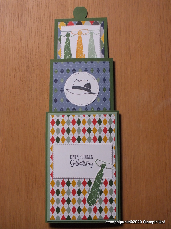 Es ist nicht immer einfach, eine Männerkarte zu gestalten. Mit dieser Kartenform und dem männlichen Designerpapier von Stampin’Up! passt es. Es handelt sich um eine Interaktive Karte nach einer Idee von @sonjamehl. Diese Karte habe ich schon im Oktober als Freitagsidee gezeigt. Diesmal ist ein Minialbum daraus geworden.