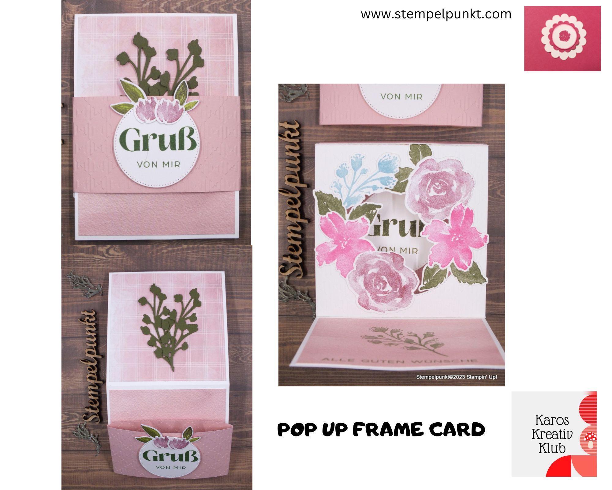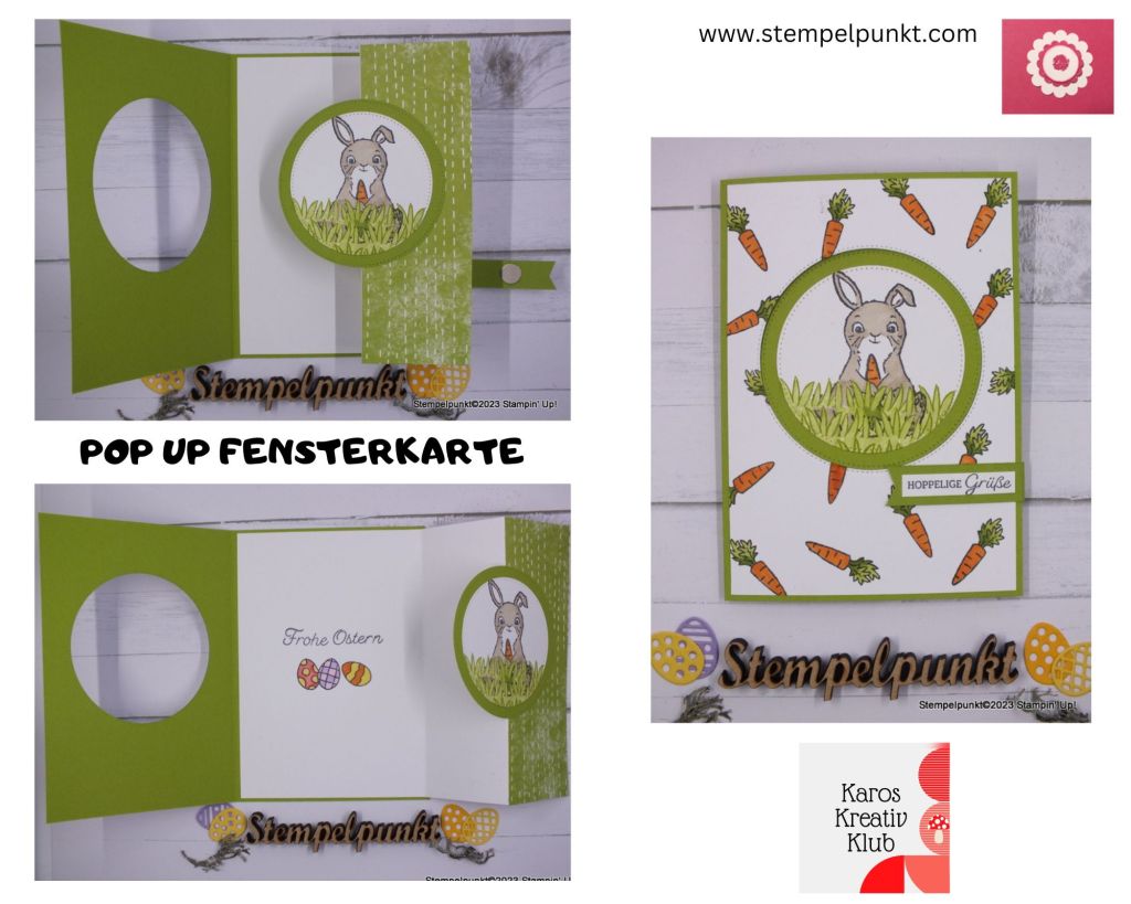 Gestern wurde wieder in Karos Kreativ Klub gebastelt. Dabei ist diese österliche POP UP FENSTERKARTE entstanden. Ich habe das Designerpapier selbst gestaltet‘ und das Stempelset ‚Osterhase‘ von Stampin‘ Up! verwendet. Bei dem Häschen habe ich mit Maskiertechnik gearbeitet.