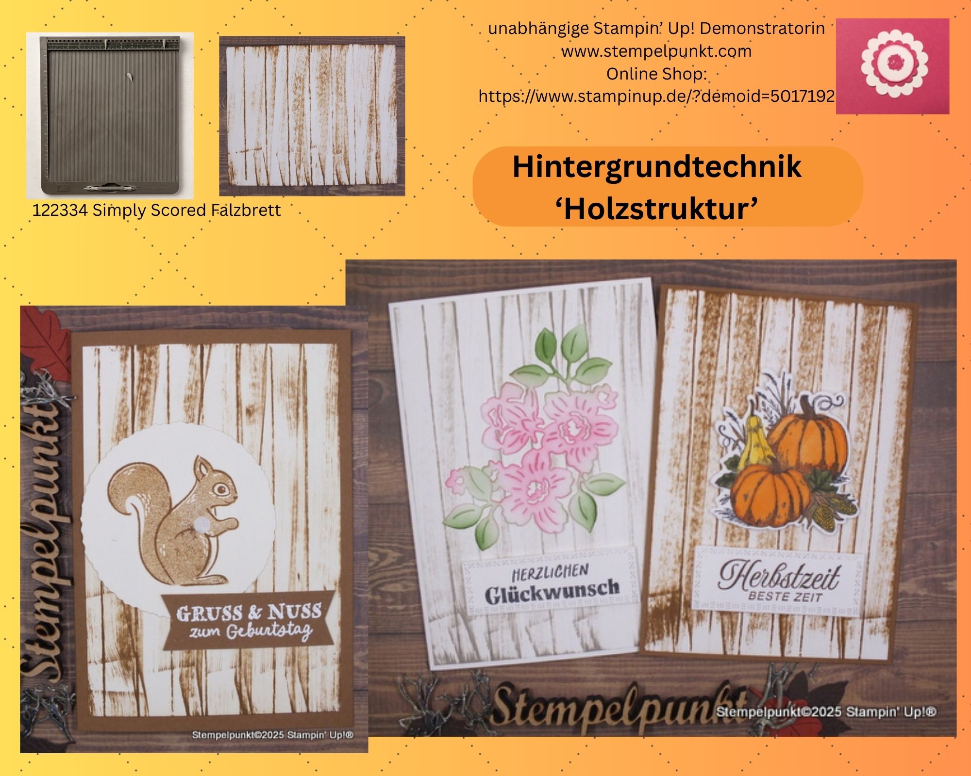 Heute möchte ich eine tolle Technik für einen Hintergrund in Holzstruktur zeigen. Der Hintergrund hat einen 3-D-Effekt. Und dadurch wirkt er natürlicher als einfaches Designerpapier. Du brauchst Stampin‘ Spots und ein Simply Scored Falzbrett. Ersatzweise kann man auch einen Papierschneider zum Falzen verwenden. In meinem Video habe ich schon einige Produkte aus dem neuen Minikatalog von Stampin‘ Up! (ab 3. September) verwendet.