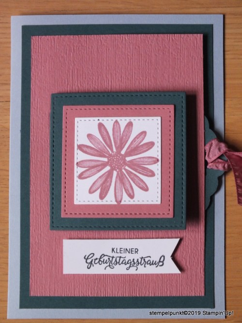 Heute zeige ich euch eine Karte, die mir vom Basteltisch gehüpft ist, als ich gelesen habe, dass es das Produkt-Medley ‚Alles Wunderbare‘ wieder gibt- und das auch noch 15% reduziert. Die Kartentechnik heisst ‚Triple Mat Technique‘. Die Farben ‚Pfauengrün‘ und ‚Rokoko-Rosa‘ harmonieren wunderbar.