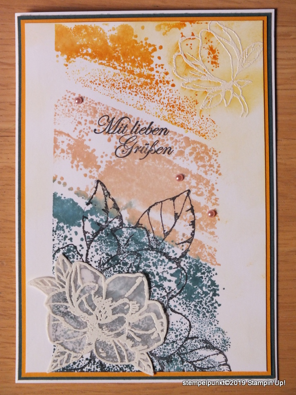 Eine Karte, hergestellt mit der Smack Down- Technik. Hier ist meine gewählte Farbe: ‚Tannengrün‘. Zu dieser Technik habe ich schon vor einiger Zeit ein Video gedreht: