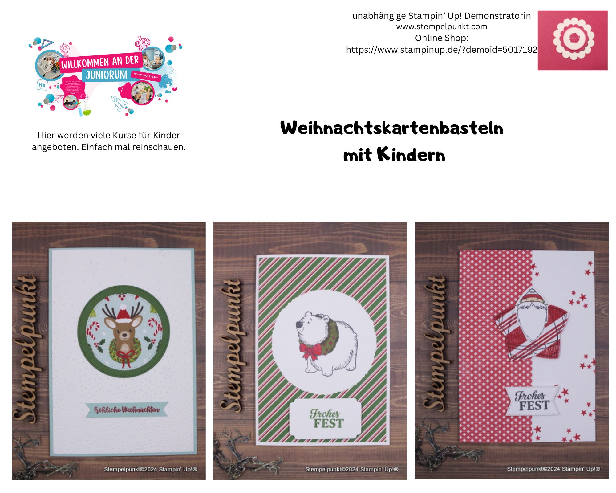 Im November hatte ich einen Weihnachtskartenkurs für Kinder an der Junioruni Mönchengladbach für Kinder im Alter von 7-10 Jahren. Wir haben diese drei Karten gebastelt. Es wurden Stempelsets, Stempelkissen, Farbkarton, Designerpapier… von Stampin‘ Up! verwendet. Die Kinder haben das wunderbar in 1,5 Stunden geschafft.