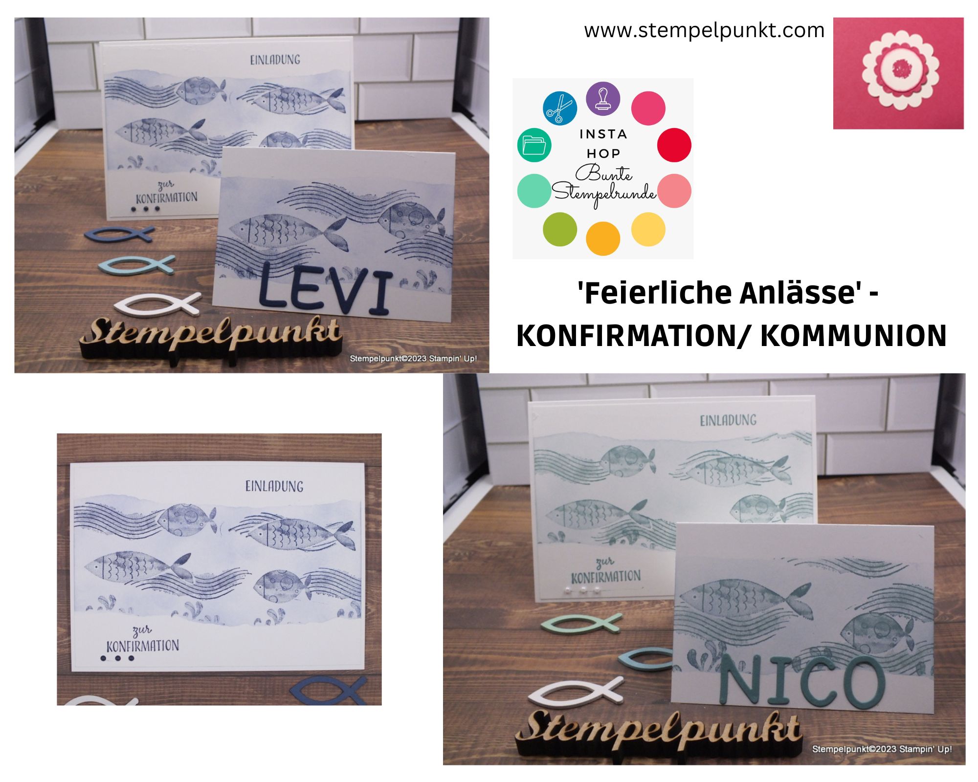 Beim 6.Bunte Stempelstunde Insta Hop geht es um das Thema ‚Feierliche Anlässe‚. Ich zeige eine Einladungskarte und ein Tischkärtchen für Konfirmation/ Kommunion. Dazu eignet sich das Stempelset ‚Feierliche Fische‘ von Stampin‘ Up! perfekt. Leider steht es auf der Auslaufliste*** – also noch ganz schnell bestellen!!!