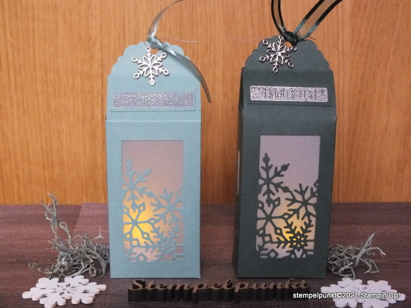 Ich zeige eine kleine Laterne mit Beleuchtung in den aktuellen In Colors ‚Seladon‘ und ‚Lodengrün‘. Ich habe wieder die tollen Stanzformen ‚Festtagsfreude‘ verwendet, die man auch wunderbar für Geschenkanhänger einsetzen kann. Die Idee kommt von ‚Created by Ottaway‘. Allerdings habe ich für die Laterne 1 Blatt Farbkarton (20 cm x 20,5 cm) verwendet, d.h. meine Skizze ist anders. Bei Bedarf meldet euch bei mir.