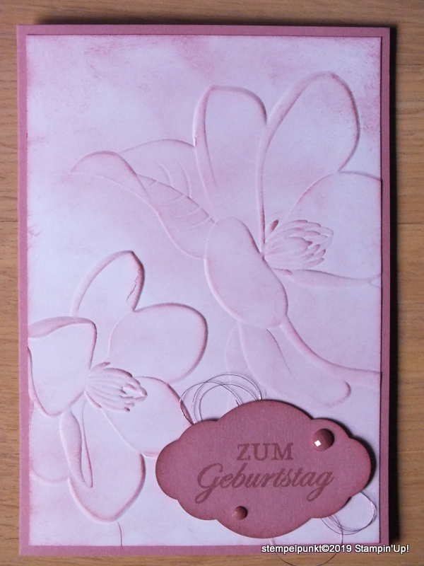 Meine Farbe ist ‚Rokoko-Rosa‘- eine der neuen In Colors. Der Aufleger wurde mit der Prägeform ‚Magnolien‘ geprägt, und die Oberfläche wurde mit einem Schwämmchen in ‚Rokoko-Rosa‘ eingefärbt.