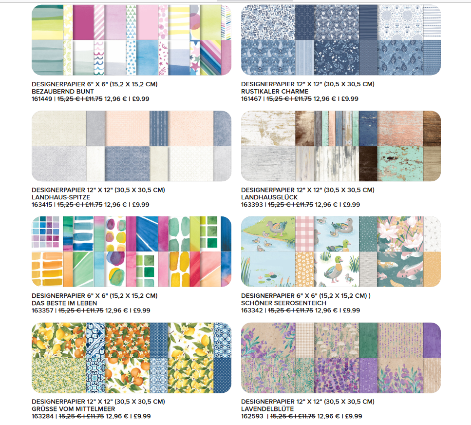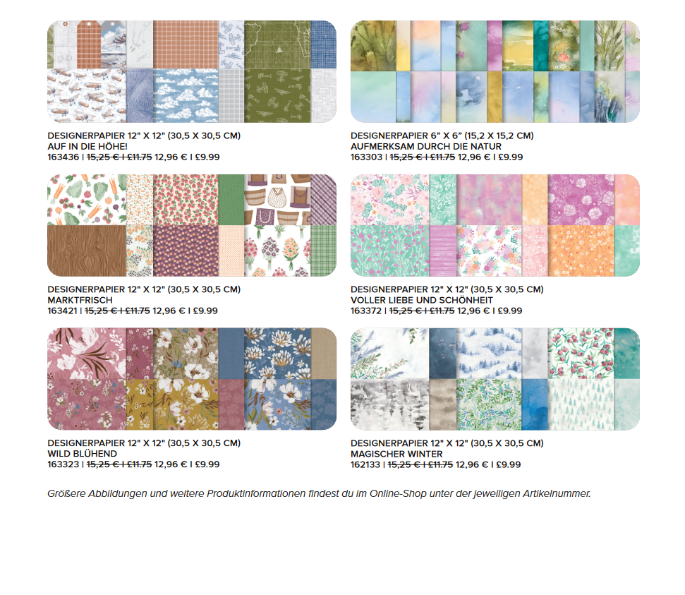 In der Zeit vom 6. bis zum 31. August ist ausgewähltes Designerpapier aus dem Jahreskatalog 2024–2025 mit 15 % Preisnachlass erhältlich: der perfekte Zeitpunkt, um sich mit Ihren Lieblingsdesigns einzudecken – und dabei zu sparen!