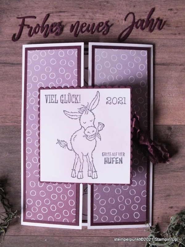 Die Eselchen sollen euch Glück bringen im neuen Jahr. Für die Herstellung der Karte habe ich zwei tolle Produkte aus der Sale-a-Bration (SAB), die am 5. Januar beginnt, verwendet: das süße Stempelset ‚Grüße auf vier Hufen‘ und das wunderschöne Designerpapier ‚Ombré‘. Das Tolle ist, dass ihr diese Produkte geschenkt bekommt. Ab einem Einkaufswert von 60€ bekommt ihr ein Produkt, bei 120€ zwei Produkte…