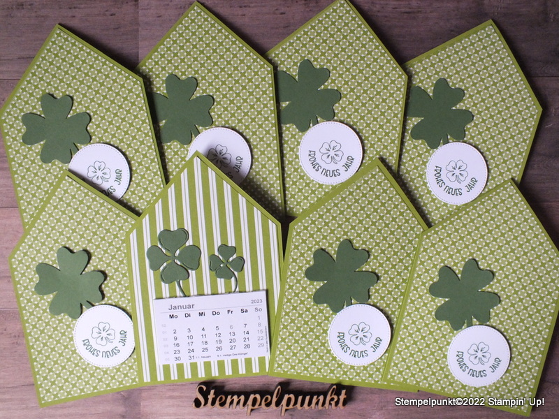 Heute zeige ich euch meine ‚Kalenderhäuschen‘. Jedes Jahr verschenke ich kleine Kalender an liebe Freunde und Verwandte. Die Idee habe ich gesehen bei Marga’s Welt. Das große Glückskleeblatt ist auf der Vorderseite. Wenn man das Häuschen aufklappt, kommt der Kalender zum Vorschein. Ich wünsche euch einen guten Rutsch ins neue Jahr.