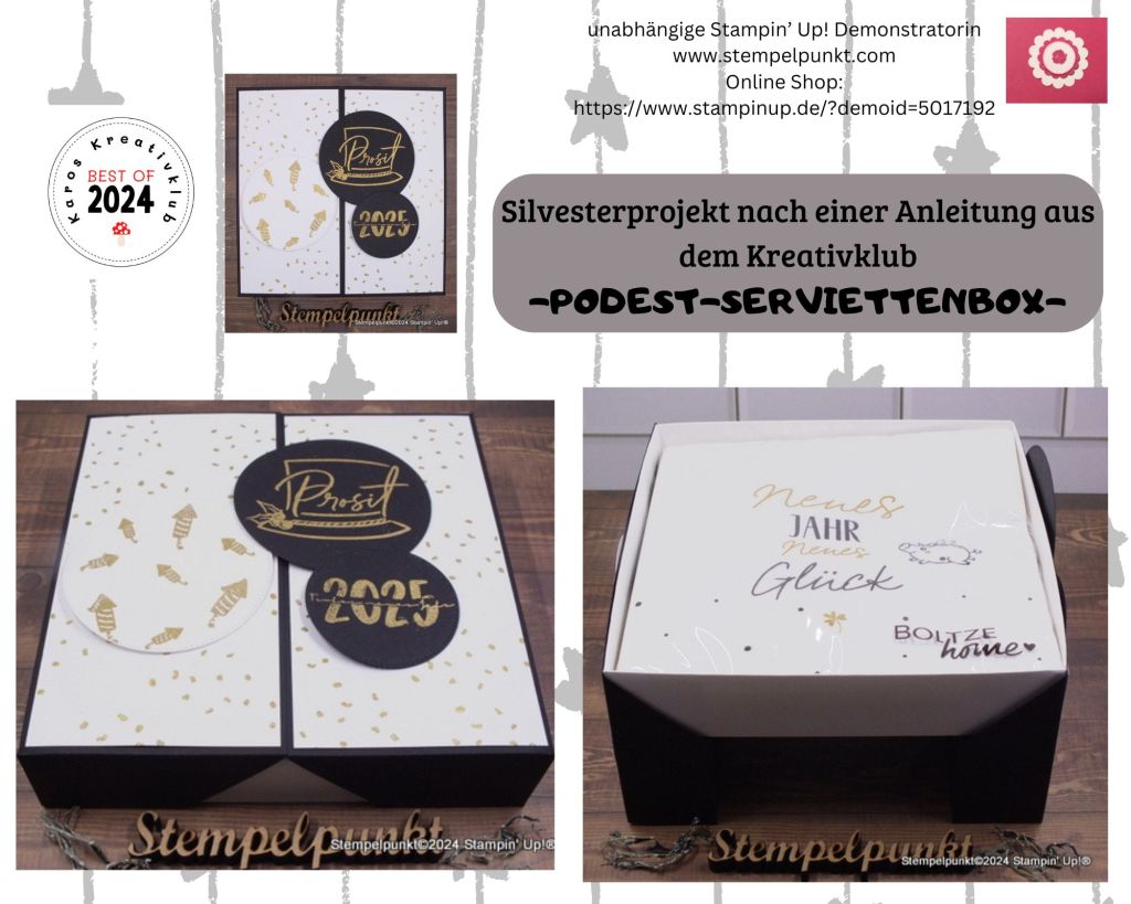 Zum Jahresende gibt es noch einige Instagram Hops zu den schönsten Projekten aus @karos_kreativklub . Unser heutiges Thema ist ‚SILVESTERPROJEKT NACH EINER ANLEITUNG AUS DEM KREATIVKLUB‘. Mir gefällt das Projekt ‚PODEST-SERVIETTENBOX‘ ganz besonders gut. Die edle, schwarz-weiße Box wird dann auch direkt verschenkt. Verwendet habe ich u.a. das Stempelset ‚Festliche Worte‘ von Stampin‘ Up! -derzeit häufig von mir benutzt. Es wurde sehr viel in Gold embosst.
