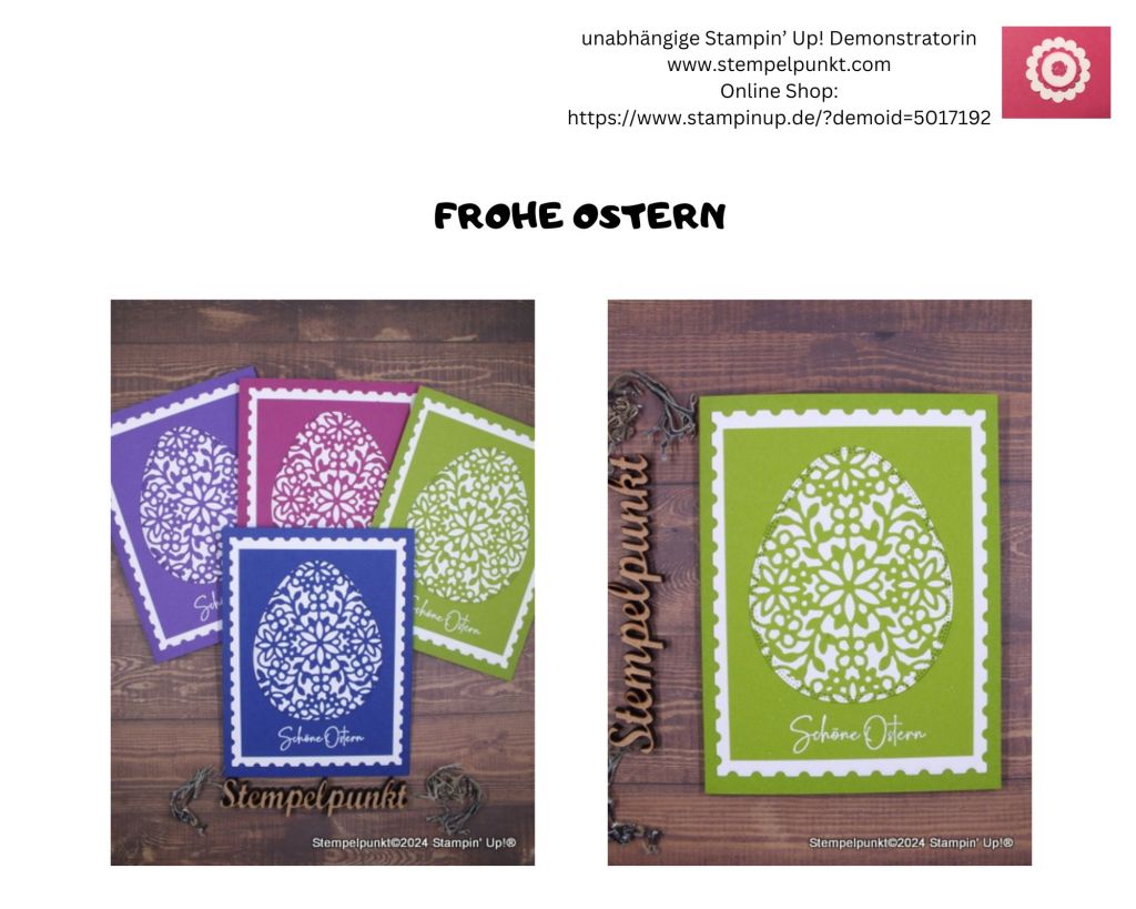 Ich wünsche euch schöne Ostertage mit euren Lieben. Diese Karten habe ich für meinen Koffermarkt gebastelt**. Gearbeitet habe ich mit den Stanzformen Originelle Ostereier‘ und ‚Ranken und Blüten’von Stampin‘ Up!