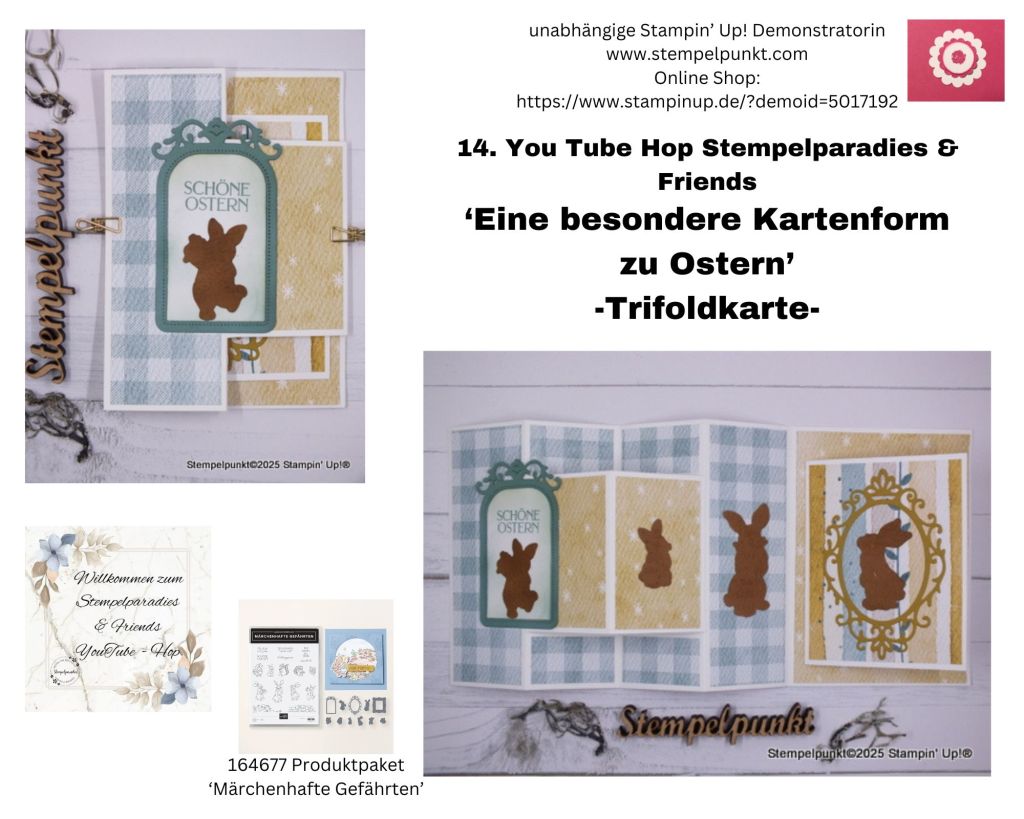 Heute gibt es im Rahmen des You Tube Hops Stempelparadies & Friends ein Video zu dem Thema ‚Eine besondere Kartenform zu Ostern‘. Ich zeige eine TRIFOLDKARTE. Gearbeitet habe ich mit dem Produktpaket ‚Märchenhafte Gefährten‘ von Stampin‘ Up!