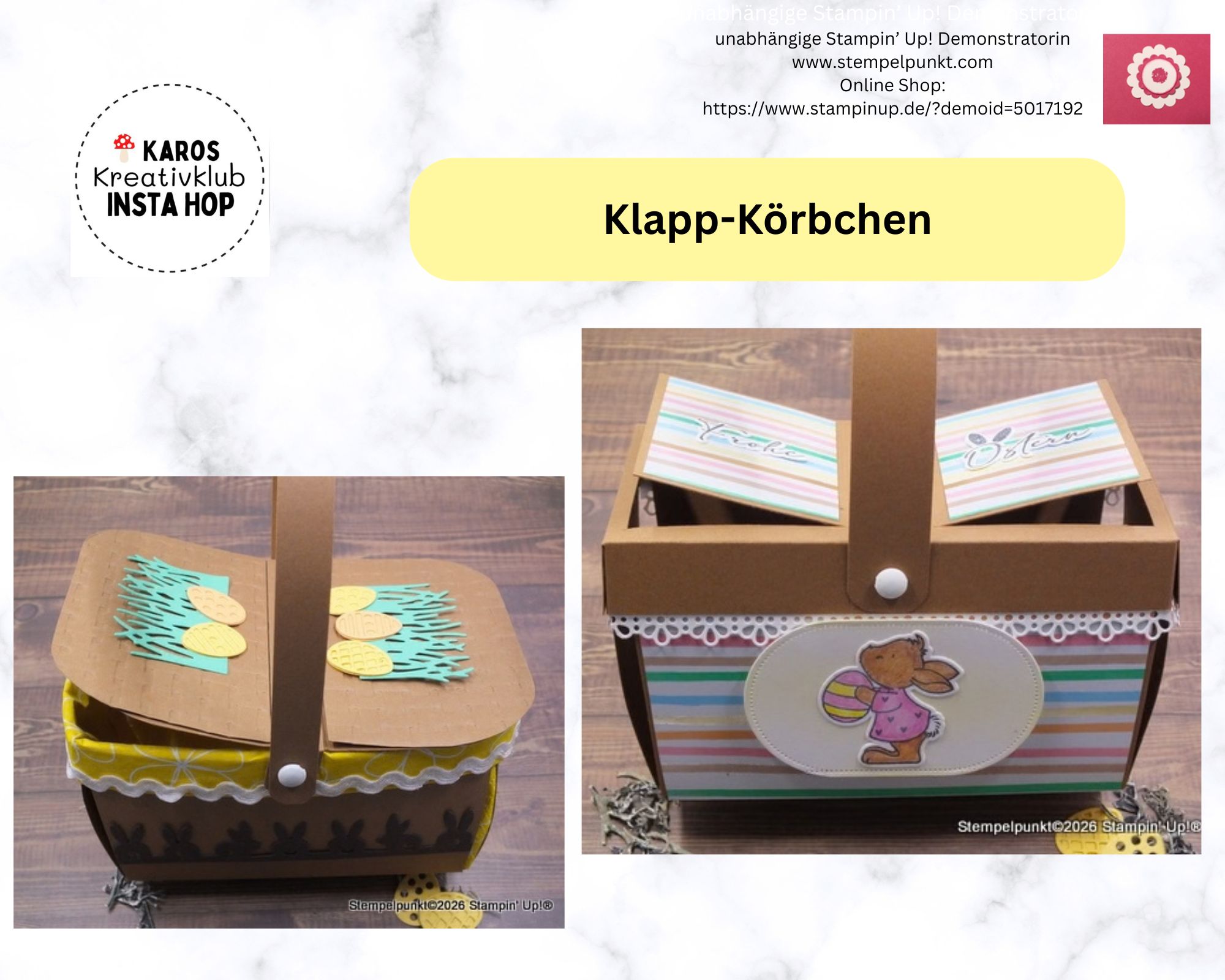 Am letzten Dienstag wurde wieder bei @karoskreativklub gebastelt. Dabei sind diese schönen ‚KLAPP-KÖRBCHEN‘ entstanden. Verwendet habe ich u.a. das Besondere Designerpapier ‚Osterfreuden‘ von Stampin‘ Up! Die Grundfarbe der Körbchen ist ‚Pekannuss‘. Mein Favorit ist das eckige Körbchen. Welches Körbchen gefällt dir besser? Schreib mir doch mal.