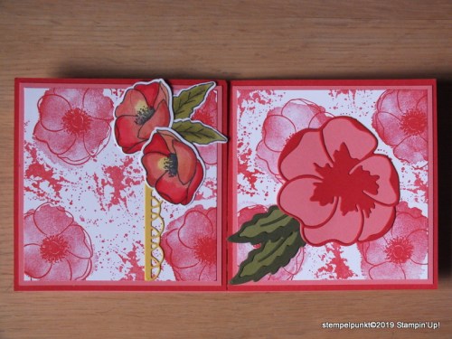 Im neuen Frühjahr-/ Sommerkatalog (ab 3.Januar) gibt es die Produktreihe ‚Mohnblütenzauber‘ mit dem Stempelset ‚Painted Poppies‘, die es mir ganz besonders angetan hat – mein absoluter Favorit. Davon werde ich euch sicherlich noch mehr zeigen. Auch das passende Designerpapier ist der Hammer. Da ich davon bisher nur ein Probepäckchen habe, habe ich das Designerpapier für den Hintergrund selbst gestempelt (in ‚Blutorange‘).