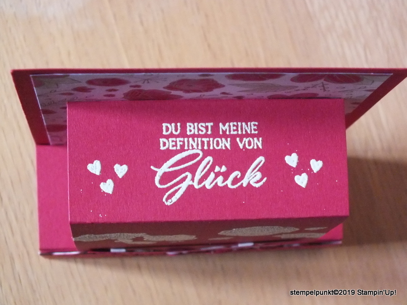 Das Zusammensetzen der Karte ist ganz einfach. Der Effekt entsteht beim Dekorieren und Verzieren des Mittelteils. Ich habe wieder einmal mein Lieblings-Weihnachtsdesignerpapier ‚Weihnachten im Herzen‘ und das Stempelset ‚Advent,Advent‘ verwendet. Die Kombination mit dem Farbkarton ‚Kirschblüte‘ ist vielleicht ungewöhnlich, aber, wie ich finde, sehr ansprechend.