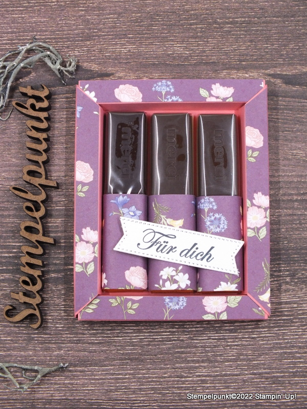 Anleitungen für Shadow Boxen findet man im Internet. Ich habe die Maße angepasst, so dass drei Riegel hineinpassen. Und mit Designerpapier wurde noch ein wenig verschönert. Das tolle Designerpapier ‚Wundervolle Welt‘ gibt es noch bis Ende August gratis bei einer Stampin‘ Up!- Bestellung ab 120€ – zusammen mit einem wunderschönen Stempelset (Sale-a-Bration). Diese projekt ist sehr gut für Anfänger geeignet, da nicht viel benötigt wird. Das Etikett kann zut Not auch einfach als Fähnchen geschnitten werden.