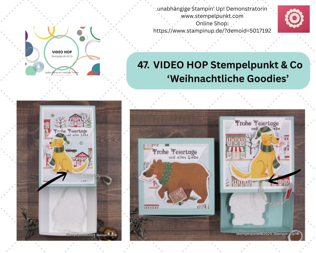 Heute gibt es den 47. VIDEO HOP von Stempelpunkt & Co. Einige Stampin‘ Up!-Demonstratorinnen haben sich zusammengetan, um euch an jedem 2. Samstag im Monat jeweils ein Video zu einem vorgegebenen Thema zu zeigen. Diesmal wurde der Termin vorgezogen, damit noch genug Zeit für die Produktion der Goodies bleibt. Unser Thema im Dezember ist ‚WEIHNACHTLICHE GOODIES‘.