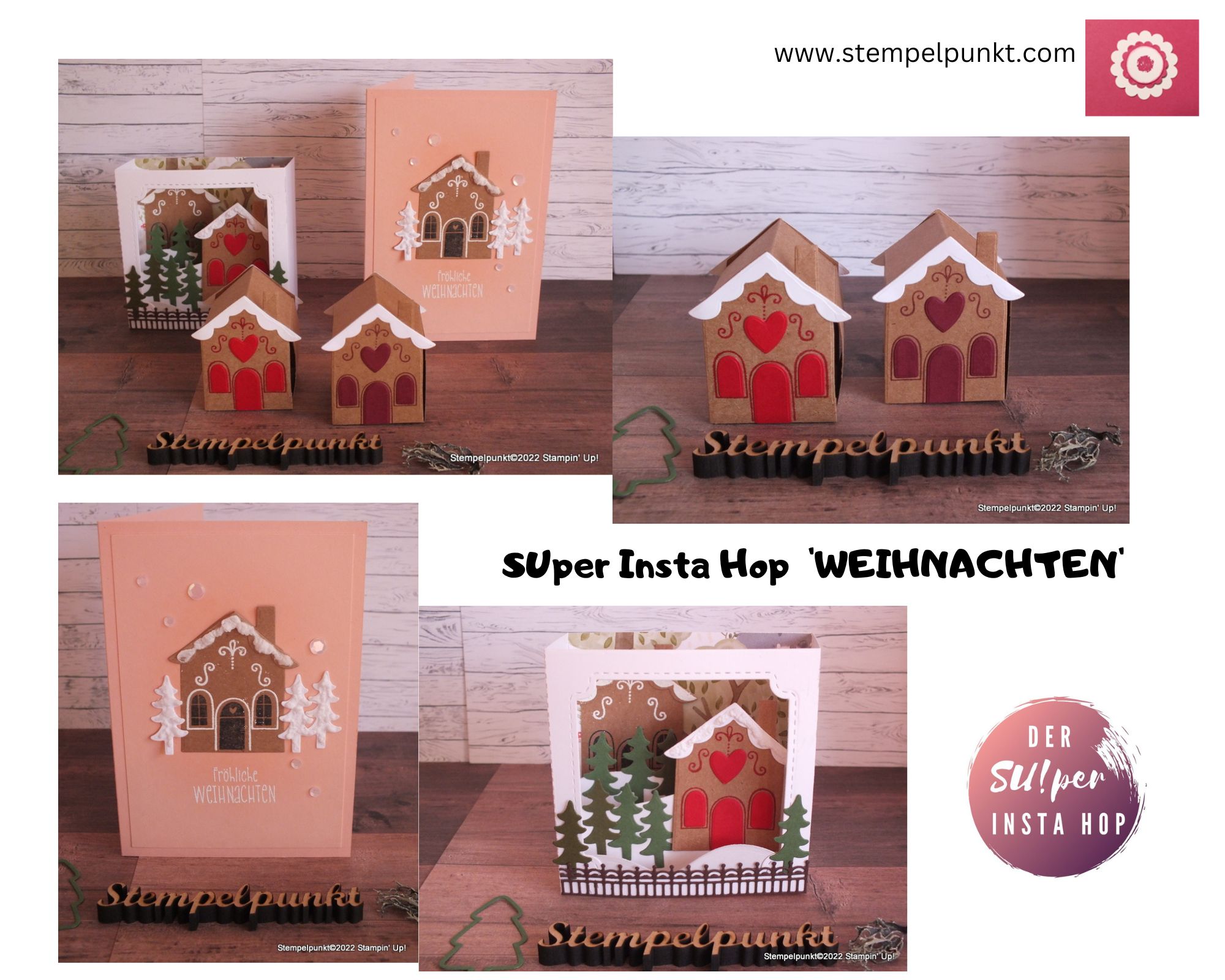 Bei mir dreht sich alles um das Produktpaket ‚Süsse Weihnachtszeit‘. Ich habe kleine, befüllbare Häuschen, eine Szenenkarte und eine Grußkarte gewerkelt.