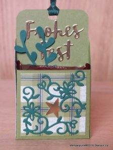 Die Box ist in den Farben ‚Olivgrün‘ und ‚Tannengrün‘ gehalten. Ich bin total verliebt in das Designerpapier ‚Winterfreuden‘. Die Vorgehensweise ergibt sich aus der Anleitung und der Liste der verwendeten Produkte.