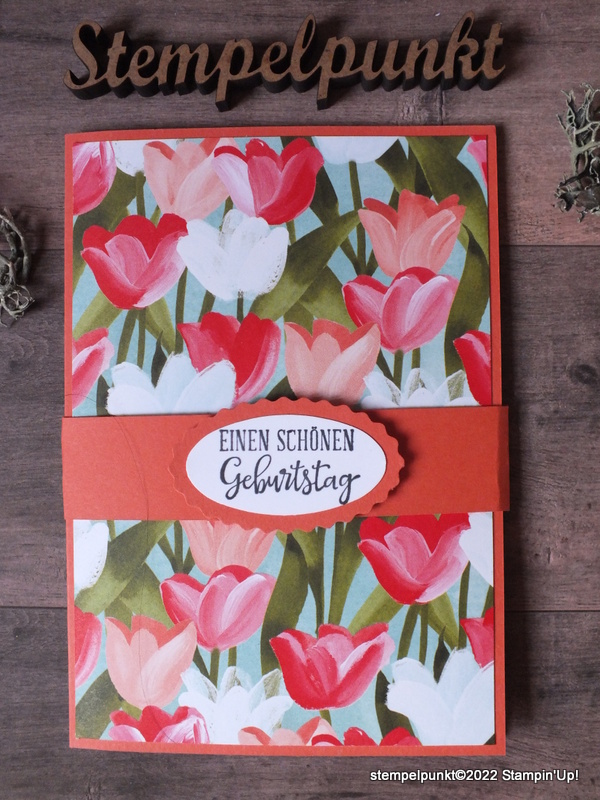 Verwendet habe ich das Stempelset ‚Sag’s mit Tulpen‘ und die passenden Stanzformen. Bei den Stanzformen ‚Tulpen‘ findet ihr auch die tolle Stanze für den Hintergrund. Ich finde, es ergibt sich ein superschöner künstlerischer Effekt. Diese kleine Stanzform wird gerne übersehen!