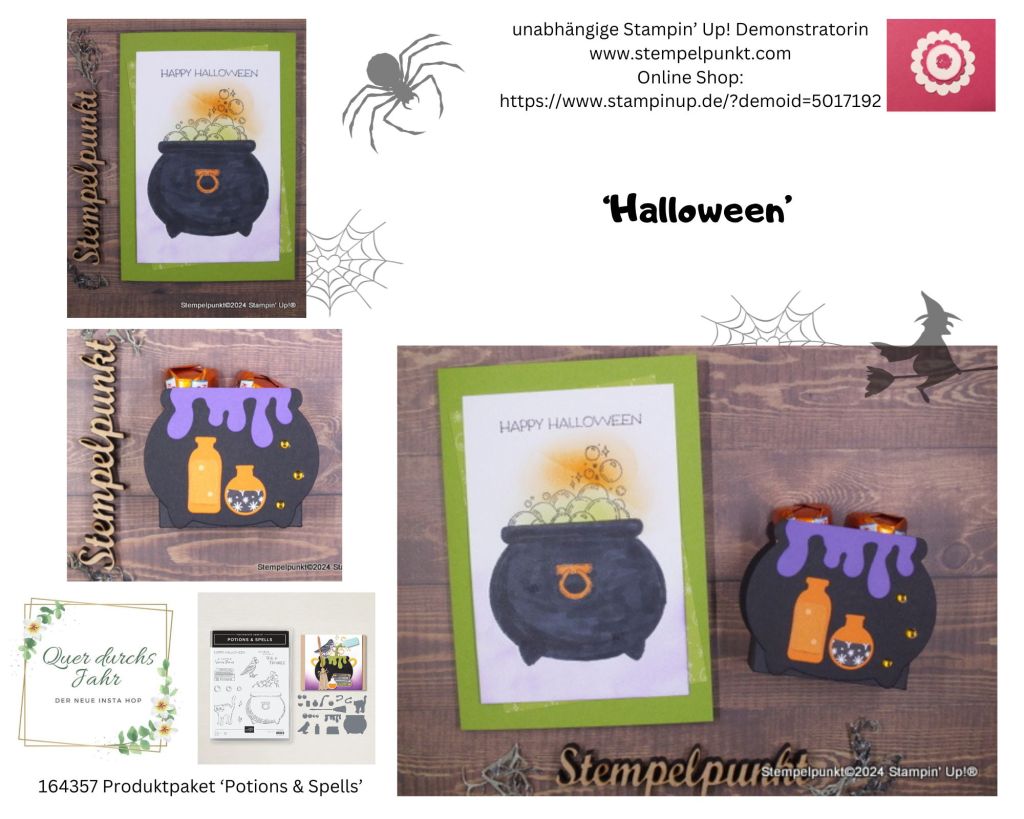 Ich zeige eine Grußkarte** und eine kleine Verpackung für Süßigkeiten. Gearbeitet habe ich it dem Produktpaket ‚Potions & Spells‘ (Exklusiv Online-Produkt).