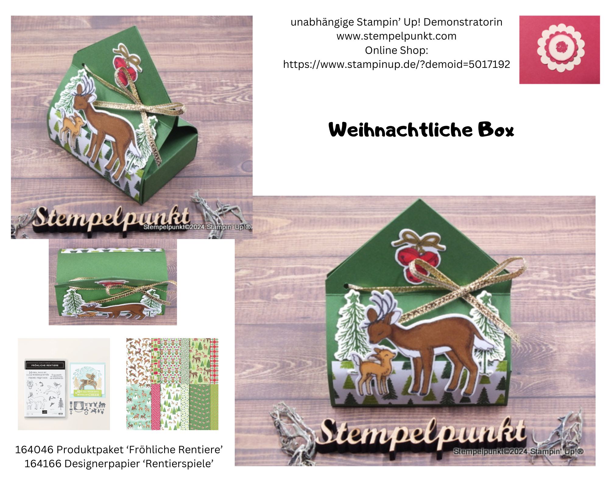 Heute zeige ich eine weihnachtliche Box, die wie eine Tasche aussieht**. Da passt schon ordentlich etwas hinein. verwendet habe ich das tolle Produktpaket ‚Fröhliche Rentiere‘ und das passende Designerpapier ‚Rentierspiele‘. Ich habe noch eine weitere, etwas kleinere Box gebastelt. Man kann die Maße anpassen.
