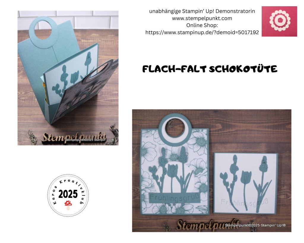 Am letzten Dienstag gab es wieder ein virtuelles Treffen in @karoskreativklub. Es wurde eine ‚FLACH-FALT SCHOKOTÜTE‘ für eine quadratische Schokolade gebastelt. Ich habe das neue Designerpapier ‚Florale Liebe‘ in der Farbe ‚Lagunenblau‘ verwendet- passend zur Schokolade.. Es wirkt sehr edel.