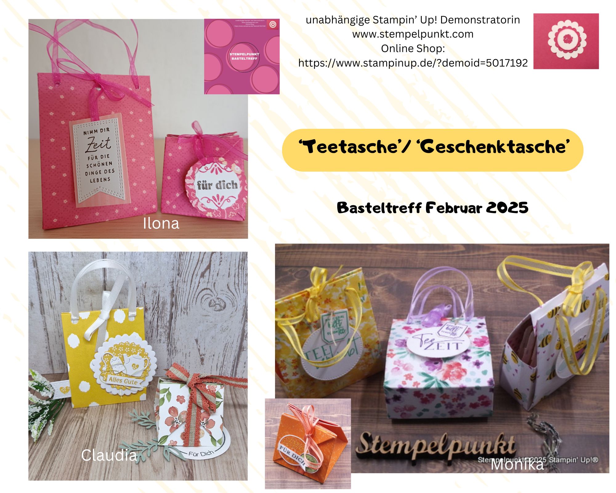Auch im Februar gab es wieder einen ‚Basteltreff‘ per Zoom. Es ist immer eine nette Runde zum Basteln und Quatschen. Diesmal haben wir gleich zwei kleine Verpackungen gewerkelt: eine Teetasche und eine kleine Geschenktasche. Wenn du auch teilnehmen möchtest, melde dich bei mir. Die Termine stehen rechts auf meinem Blog. Der nächste Termin ist am 25. März, ab 19.00 Uhr. Den Zugangslink gibt es immer nach der Anmeldung.