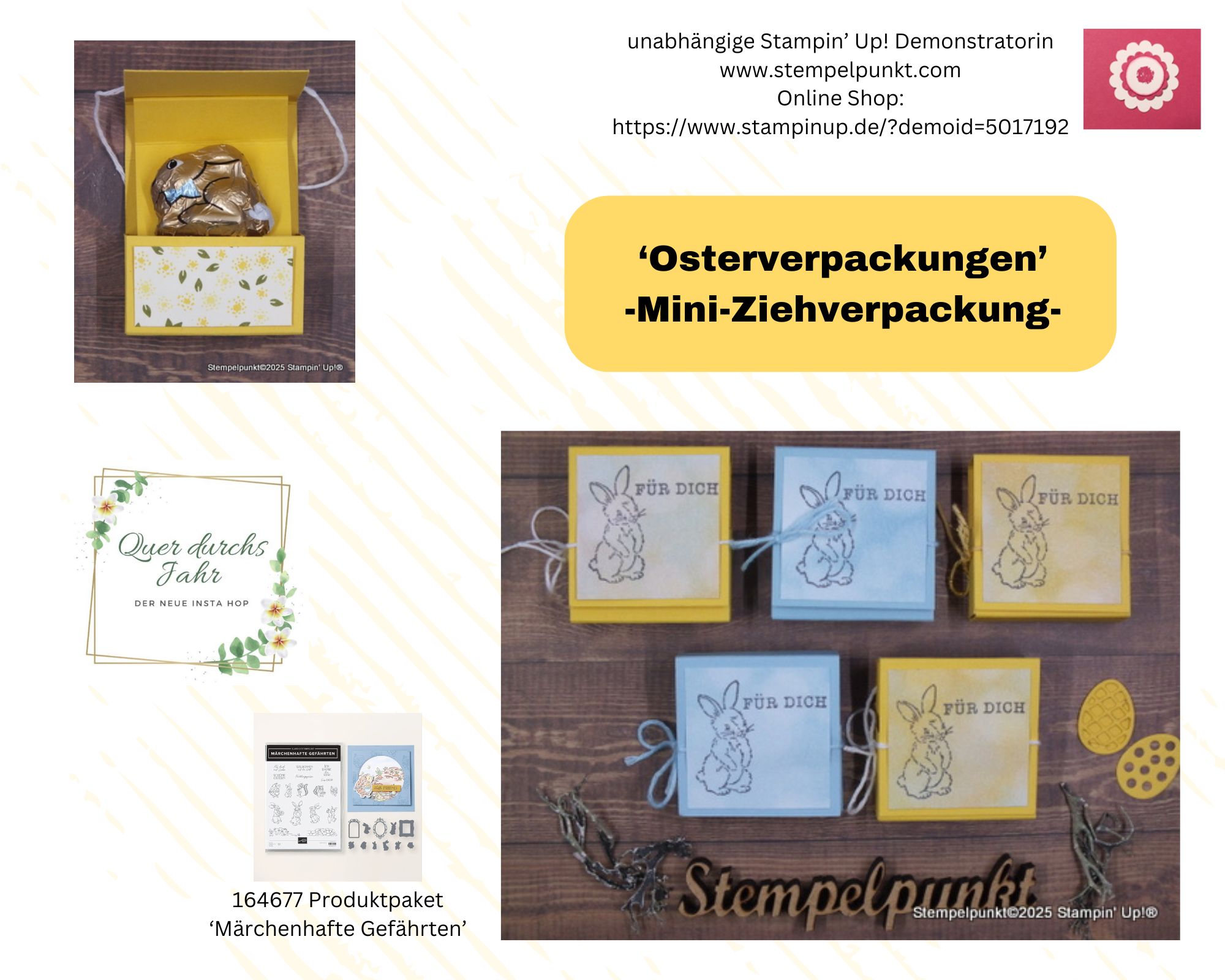 Unser heutiges Thema ist ‚OSTERVERPACKUNGEN‘. Ich zeige eine MINI-ZIEHVERPACKUNG – ein perfektes Goodie für die Oster-Kaffeetafel. Verpackt wurde ein kleiner Schokoladen-Hase. Und natürlich kam wieder das Stempelset ‚Märchenhafte Gefährten‘ mit den süßen Häschen von Stampin‘ Up! zum Einsatz.