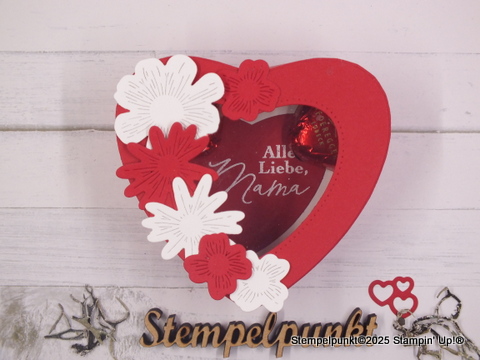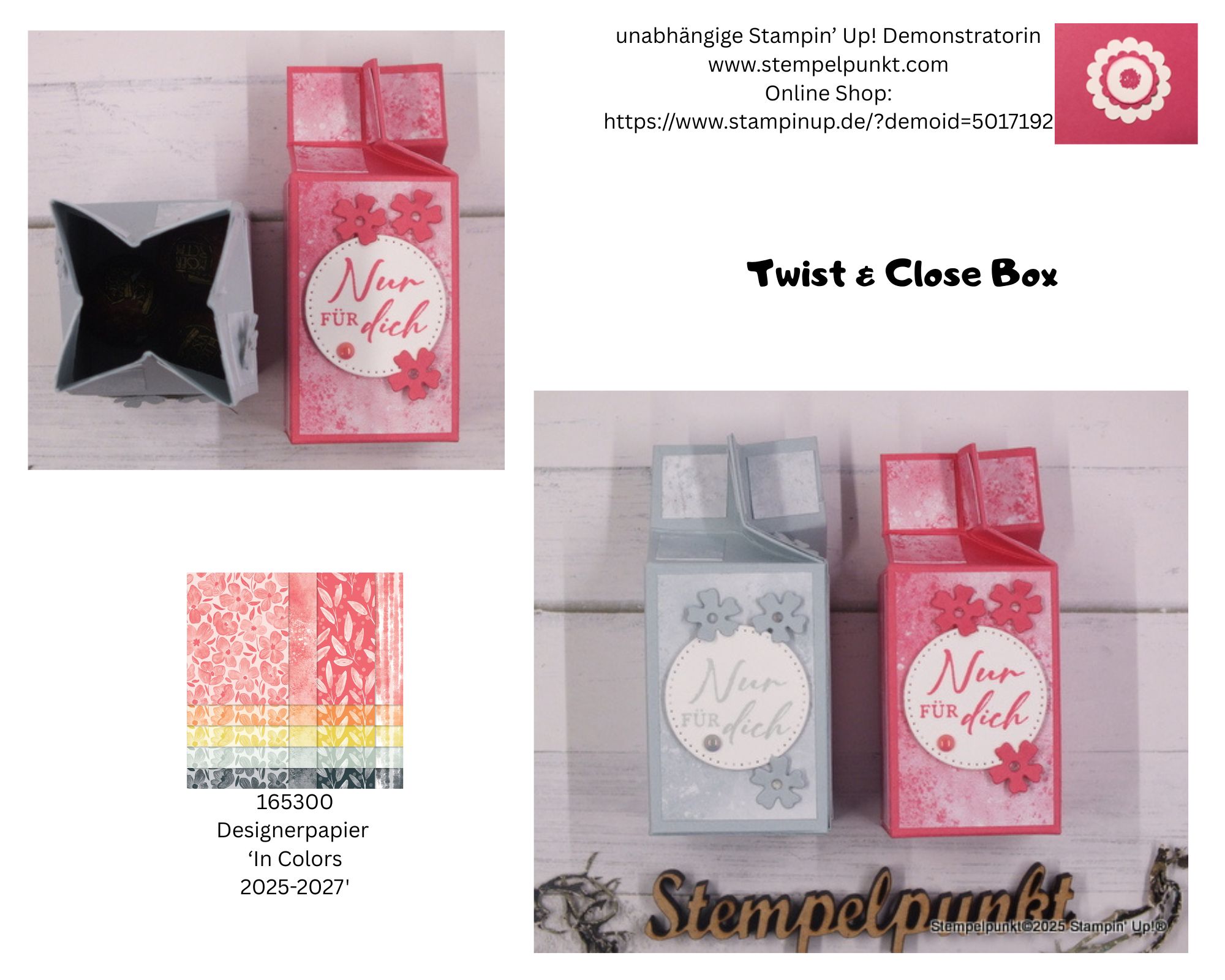Heute zeige ich eine süße kleine ‚TWIST & CLOSE BOX’**. Sie hat einen ganz raffinierten Verschluss. Ich habe mit dem Designerpapier ‚In Color 2025-2027‘ gearbeitet (hier: ‚Wolkenmeer‘ und ‚Rhabarberrot‘).
