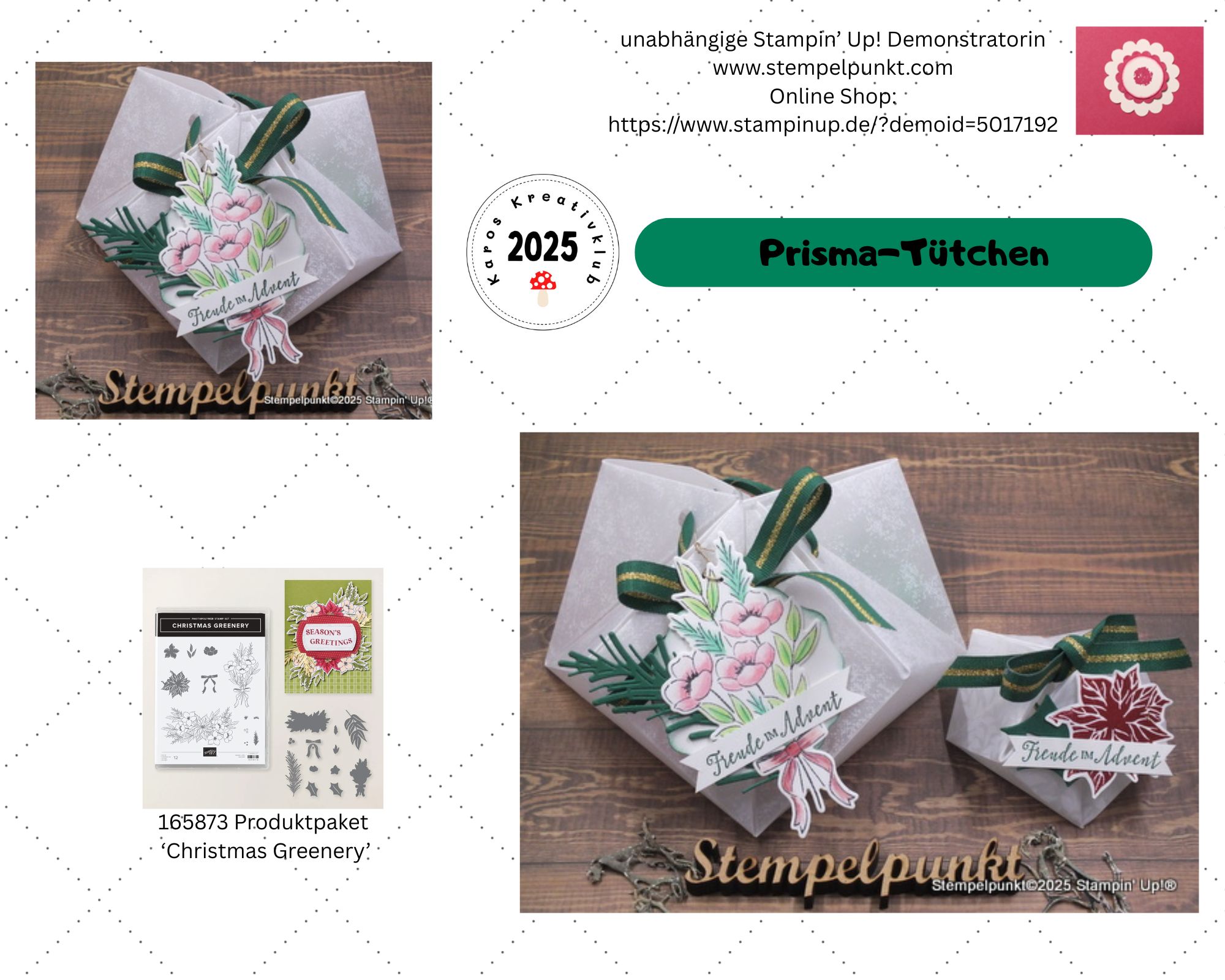 Am Mittwoch haben wir ein PRISMA-Tütchen in @karoskreativklub gebastelt. Ich habe mit gemustertem Pergamentpapier und dem Produktpaket ‚Christmas Greenery‘ von Stampin‘ Up! gearbeitet. Koloriert habe ich mit Polychromos.