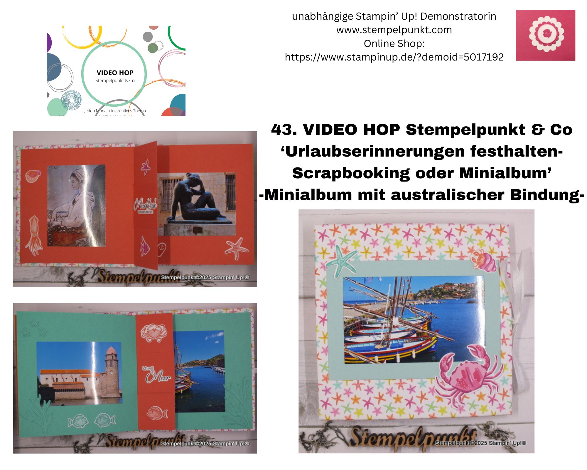 Heute gibt es den 43. VIDEO HOP von Stempelpunkt & Co. Einige Stampin‘ Up!-Demonstratorinnen haben sich zusammengetan, um euch an jedem 2. Samstag im Monat jeweils ein Video zu einem vorgegebenen Thema zu zeigen. Unser Thema im August ist ‚Urlaubserinnerungen festhalten -Scrapbooking oder Minialbum‘.