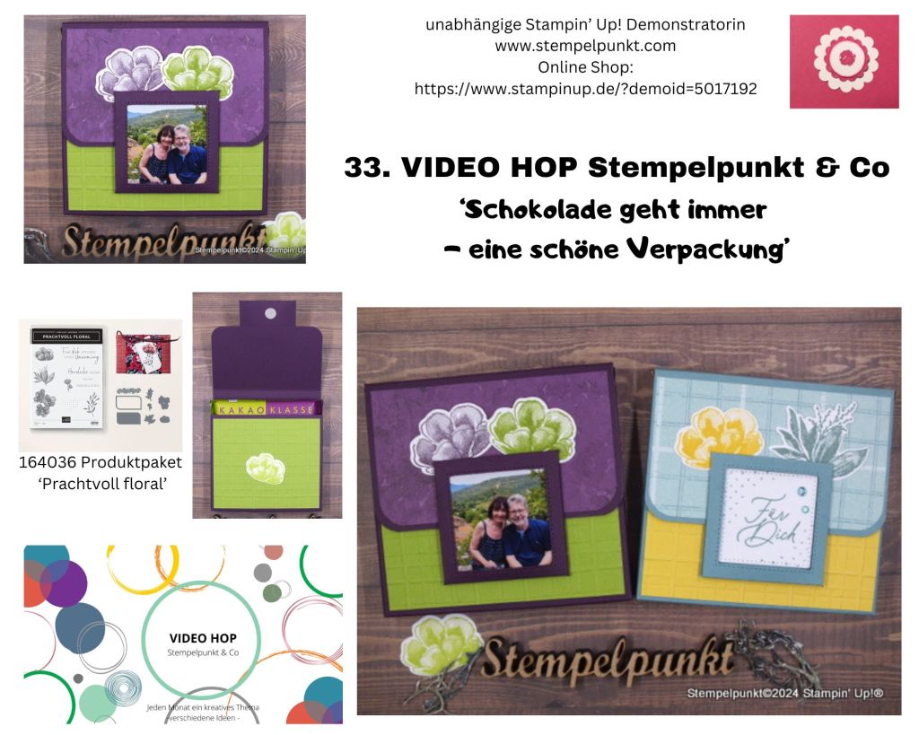 Heute gibt es den 33. VIDEO HOP von Stempelpunkt & Co. Einige Stampin‘ Up!-Demonstratorinnen haben sich zusammengetan, um euch an jedem 2. Samstag im Monat jeweils ein Video zu einem vorgegebenen Thema zu zeigen. Unser Thema im Oktober ist ‚Schokolade geht immer – eine schöne Verpackung‘. Ich zeige eine Verpackung für eine quadratische Schokolade – mit Produkten von Stampin‘ Up! .
