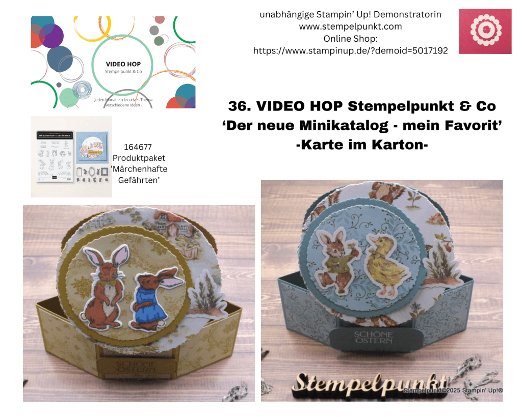 Heute gibt es den 36. VIDEO HOP von Stempelpunkt & Co. Einige Stampin‘ Up!-Demonstratorinnen haben sich zusammengetan, um euch an jedem 2. Samstag im Monat jeweils ein Video zu einem vorgegebenen Thema zu zeigen. Unser Thema im Januar ist ‚Der neue Minikatalog – mein Favorit‘. Ich zeige eine ‚Karte im Karton‘** Gearbeitet habe ich mit dem Produktpaket ‚Märchenhafte Gefährten‘ (164677) und dem Designerpapier ‚Im Märchenland‘ – mein derzeitiges Highlight aus dem neuen Minikatalog von Stampin‘ Up!.